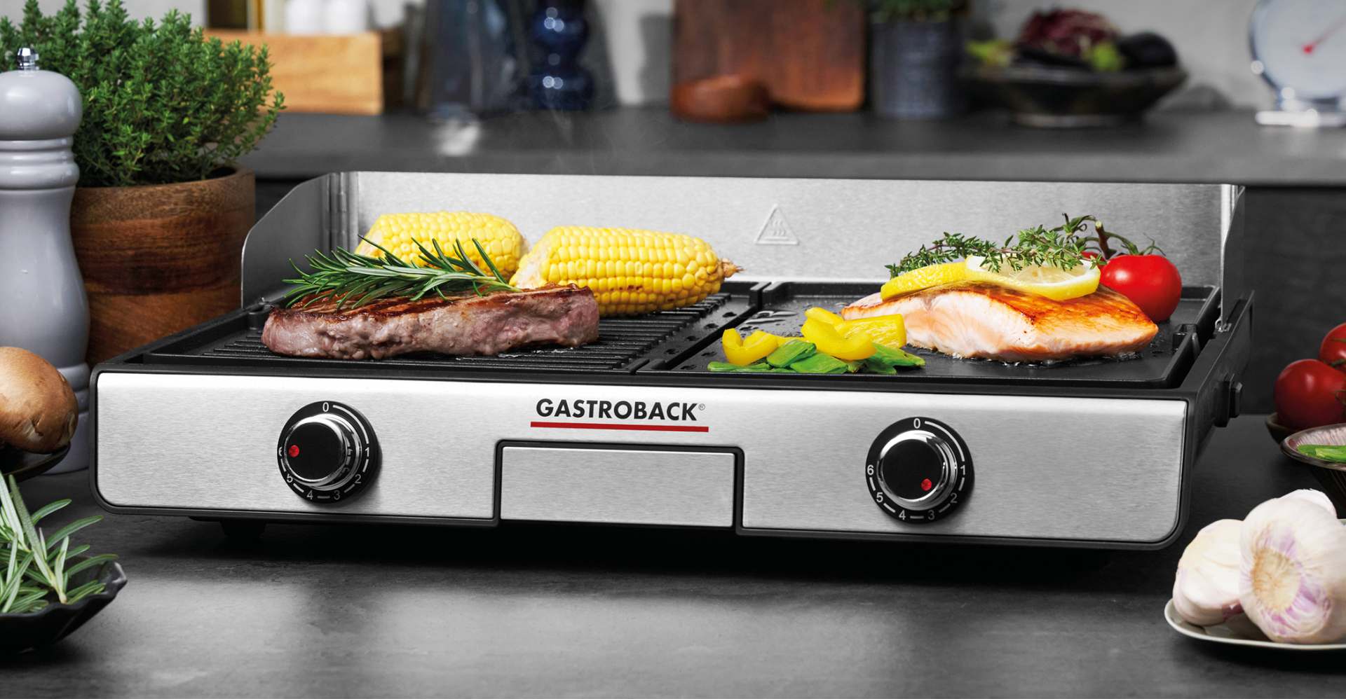 Der Gastroback Grill Design Plancha & BBQ verfügt über zwei professionelle Grill-Wendeplatten aus massivem Alu-Druckguss.