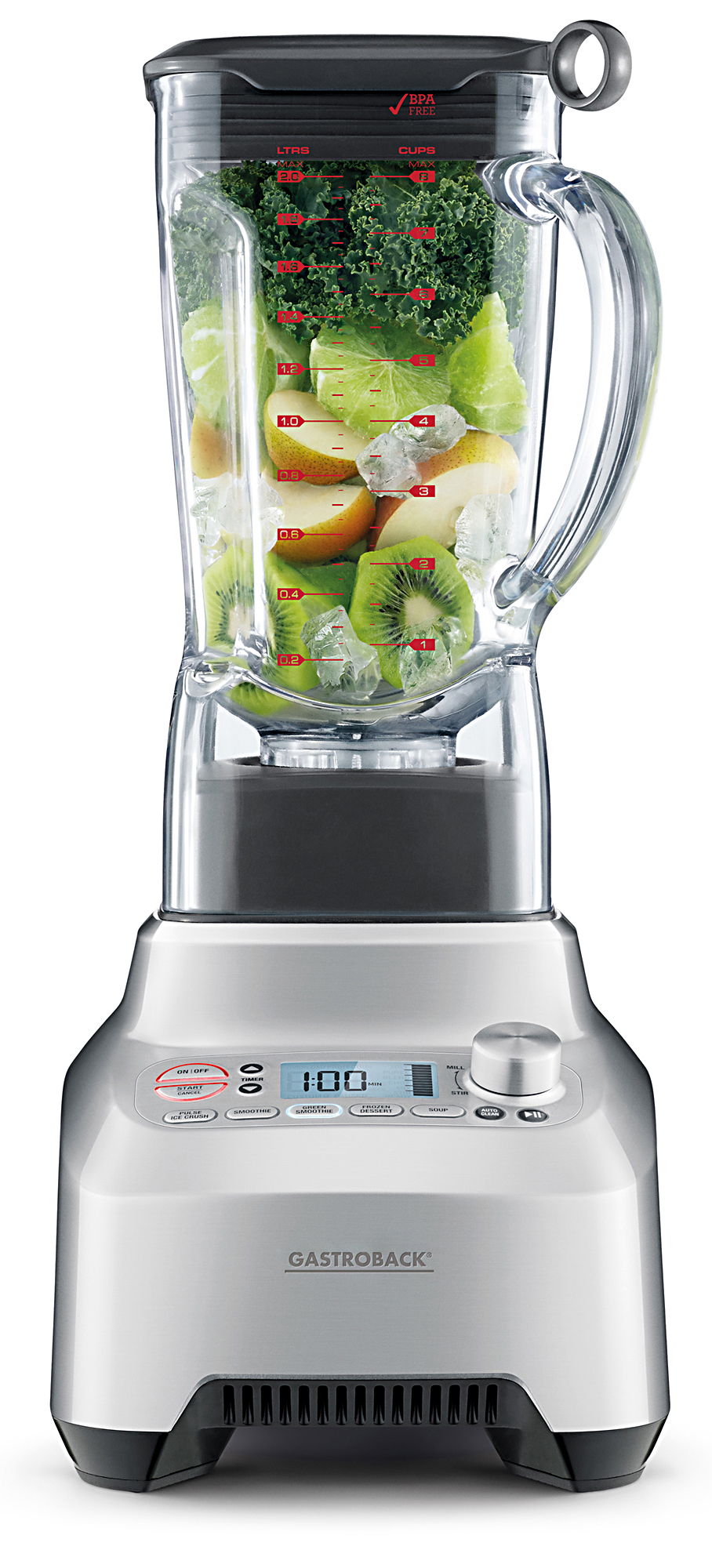 Der Gastroback Mixer Advanced Professional ist speziell für Smoothies entwickelt worden und kann mehr. Er greift auf eine einzigartige Mixtechnik – das Pro-Kinetix-System – zurück. Hierbei sorgt das 6-fach Edelstahlmesser in Kombination mit der besonderen Behälterform und hoher Motor Leistung für eine optimale Verwirbelung und besonders kleine Partikel.