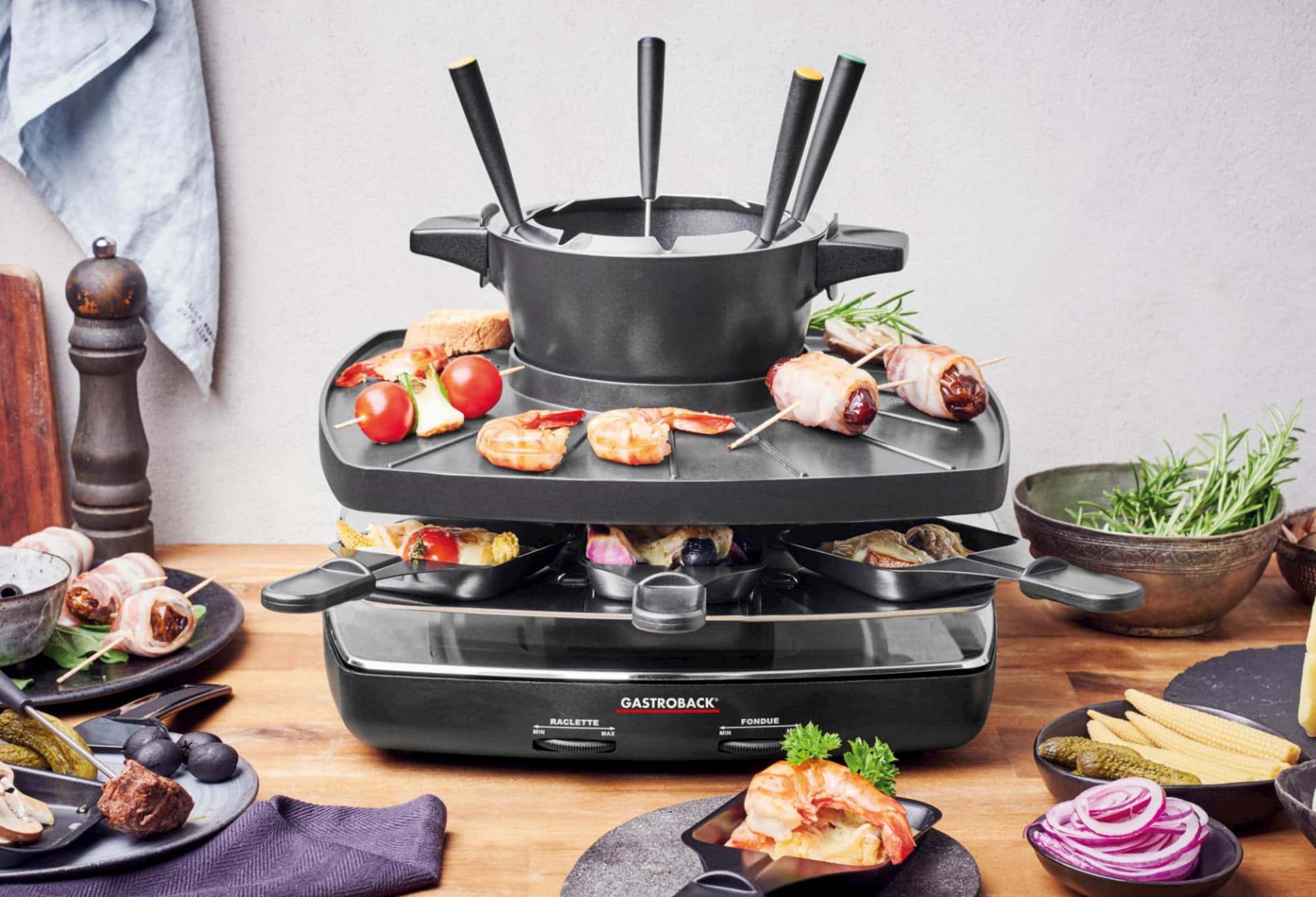 Das kompakte Gerät von Gastroback bietet drei Funktionen. Während in den acht antihaftbeschichteten Raclette-Pfännchen der Käse goldbraun zerläuft, braten ein Stockwerk höher auf der Grillplatte knusprige Fischstücke oder Meeresfrüchte im eigenen Saft und im 1.15 Liter Fondue-Topf köcheln Gemüsestücke in Brühe oder das Schokoladenfondue für den Nachtisch. Alle Funktionen können gleichzeitig wie auch einzeln genutzt werden.