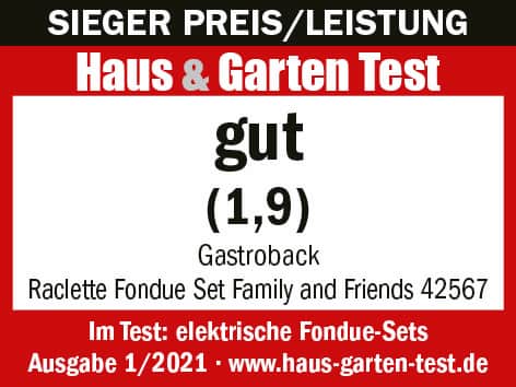Das Raclette Fondue Set Family and Friends wird in der Ausgabe 01/2021 des Magazins „Haus & Garten Test“ als ein vielseitiges Gerät beschrieben, das sich dekorativ auf der Tischmitte platzieren lässt und ausreichend Platz für ein umfangreiches Speiseerlebnis bietet. Mit der Testnote 1,6 „gut“ geht das Set aus dem Test als “Sieger Preis/Leistung“ hervor.