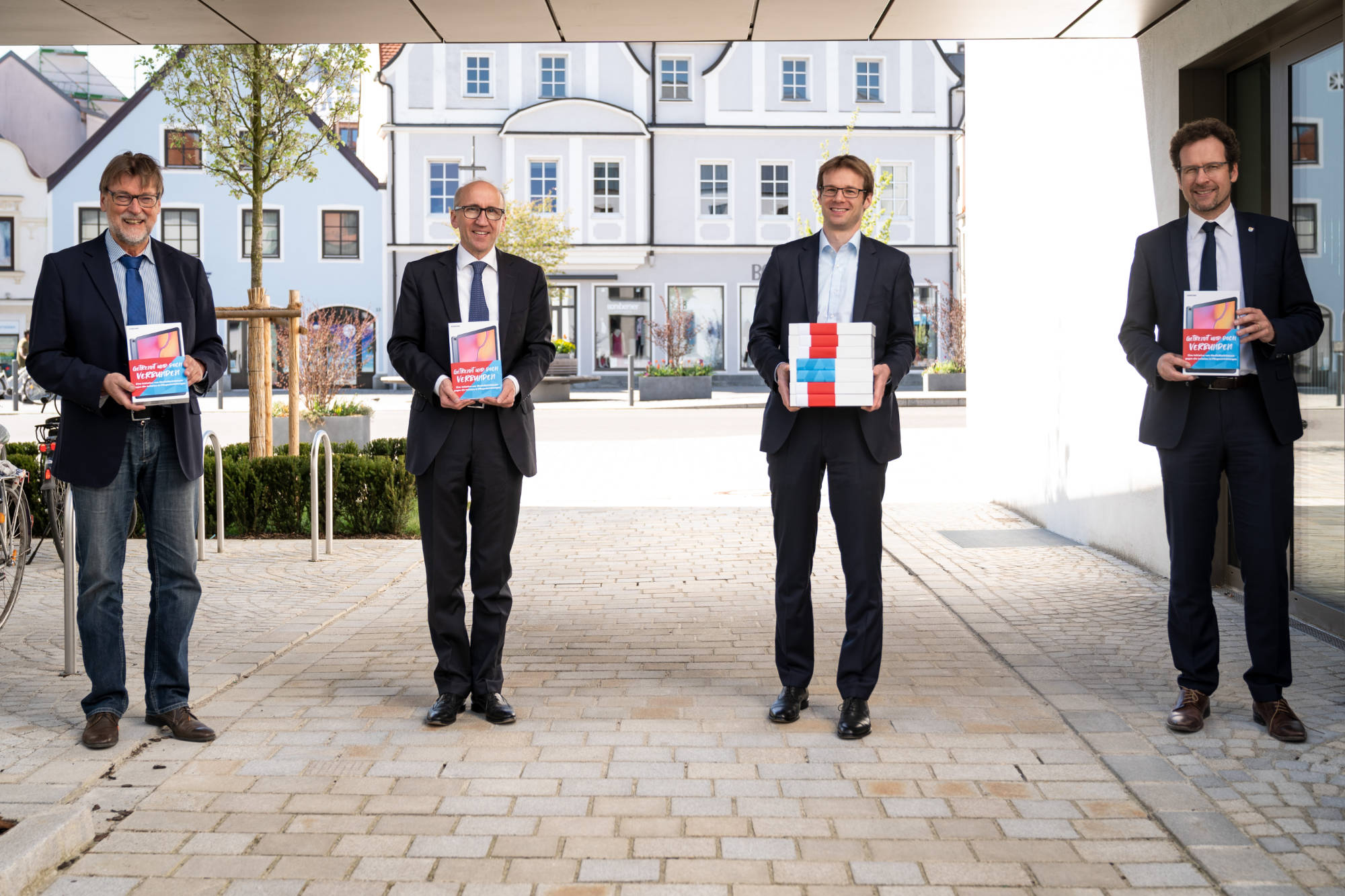 Übergabe der ersten 200 Tablets stellvertretend an das Medizinische Lagezentrum der Region Ingolstadt. Unser Foto zeigt von links: Martin Wolf (Landrat Pfaffenhofen), Dr. Florian Demetz (Ärztlicher Leiter Führungsgruppe Katastrophenschutz der Region 10), Florian Wieser, (CFO MediaMarktSaturn Retail Group) und Peter von der Grün (Landrat Neuburg-Schrobenhausen).