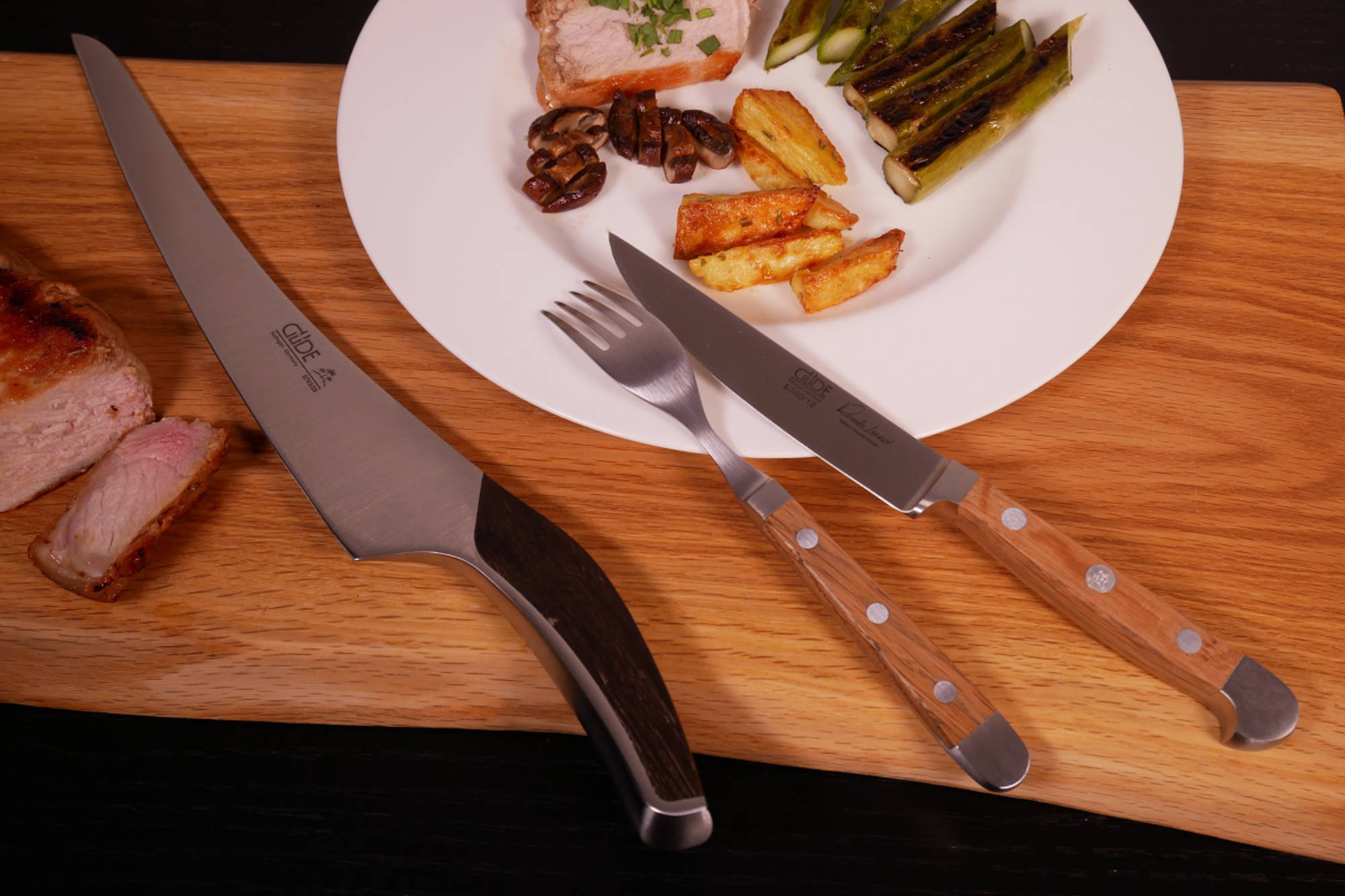 Es heißt zwar Porterhouse Steakmesser, aber schneidet auch jedes andere Fleisch. Messerspezialist Güde hat es mit dazu passender Steakgabel konzipiert. Der Griff der schönen Stücke besteht aus Fasseiche. Damit nicht genug: Auch ein Tranchiermesser darf beim Grillen nicht fehlen. Das hier gehört zur Serie Synchros – mit seiner im vorderen Bereich flexiblen Klinge geht das Filetieren perfekt von der Hand. Dank der erhöhten Griffposition ist es sogar beim Wiegeschnitt für Kräuter hervorragend geeignet.