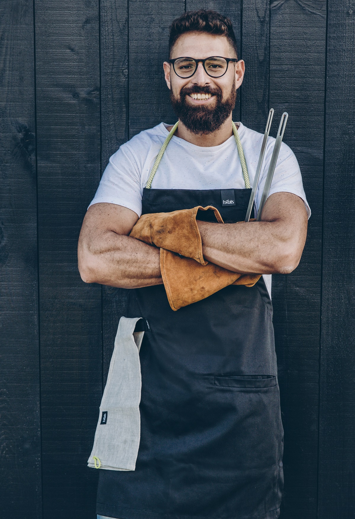 Wir dürfen endlich mal wieder eine Grillparty feiern. Also werfen wir uns in Schale! Damit die guten Klamotten vor Funkenflug und Marinade-Spritzern geschützt sind, tragen wir am Grill Schürze und Handschuhe. Das Equipment von Höfats ist aus Veloursleder und Kevlar, die Schürze ist aus Leinen.