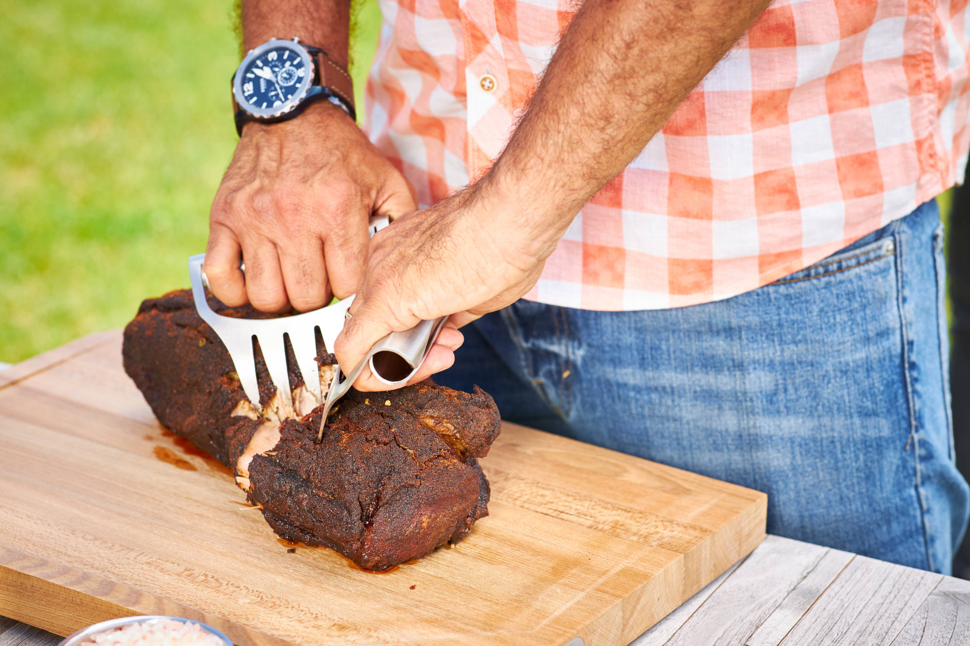 Gut Ding will Weile haben – das gilt insbesondere für Pulled Pork. Wenn es aber endlich fertig ist, dann ist es butterweich und wartet darauf, zerzupft zu werden. Ganz stilecht kann man das mit den Gabeln von Rösle machen. Die sind natürlich aus Edelstahl und können in die Spülmaschine. Die bärenklauenartigen Klauen eignen sich auch wunderbar „zum Transport“ von großen Fleischstücken.