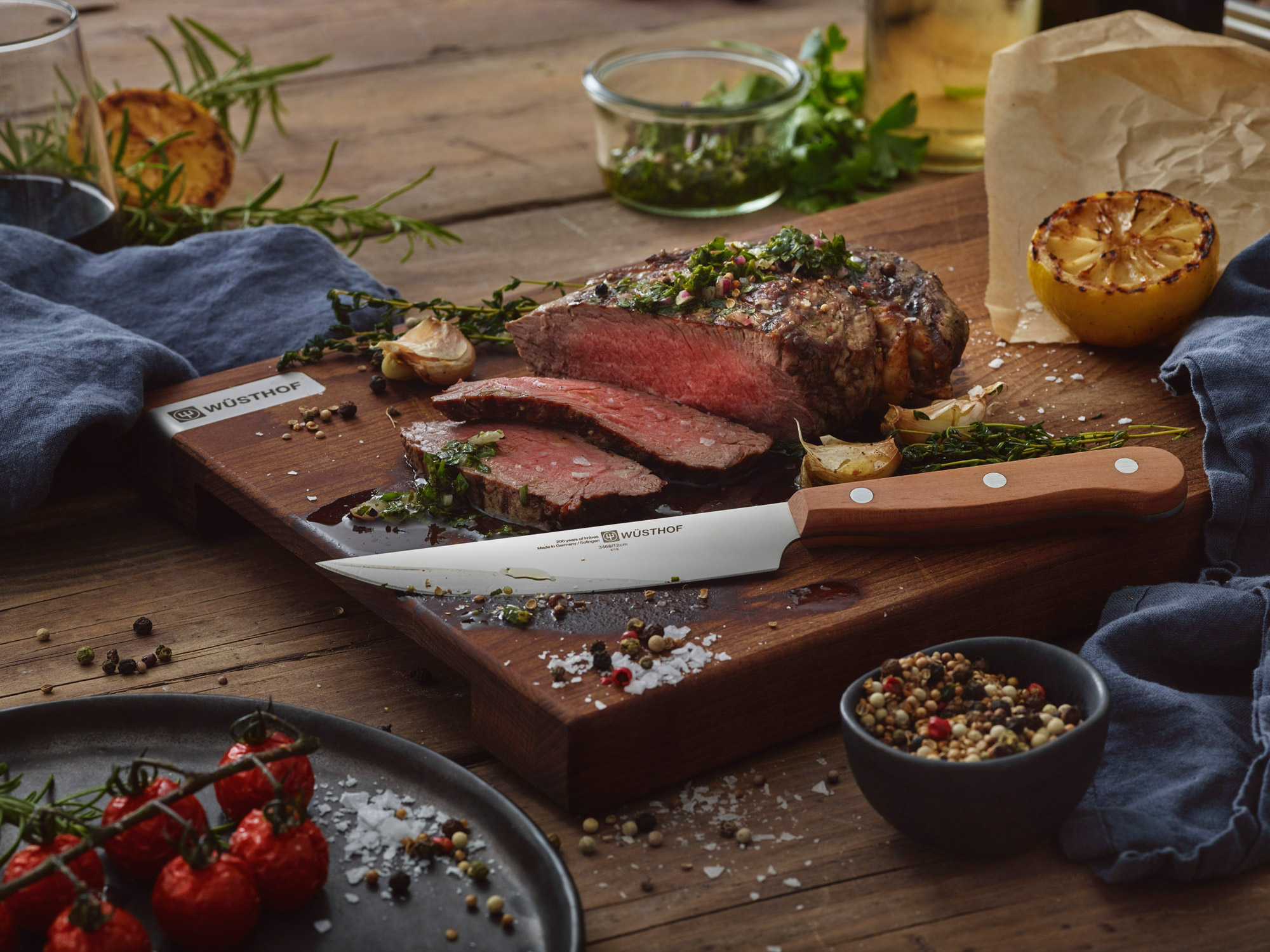 Im besten Fall ist das Steak butterzart und auf den Punkt genau gegart. Mit einem scharfen Messer geschnitten, schmeckt es noch besser … Das Steakmesser von Wüsthof kommt im Viererset in einer Holzbox. Die Klingen aus lasergeschnittenem Stahl sind extrabreit, die dreifach vernieteten Griffe sorgen für eine sichere Handhabung. Besonders schön sind die Griffe aus gemaserten Pflaumenholz.