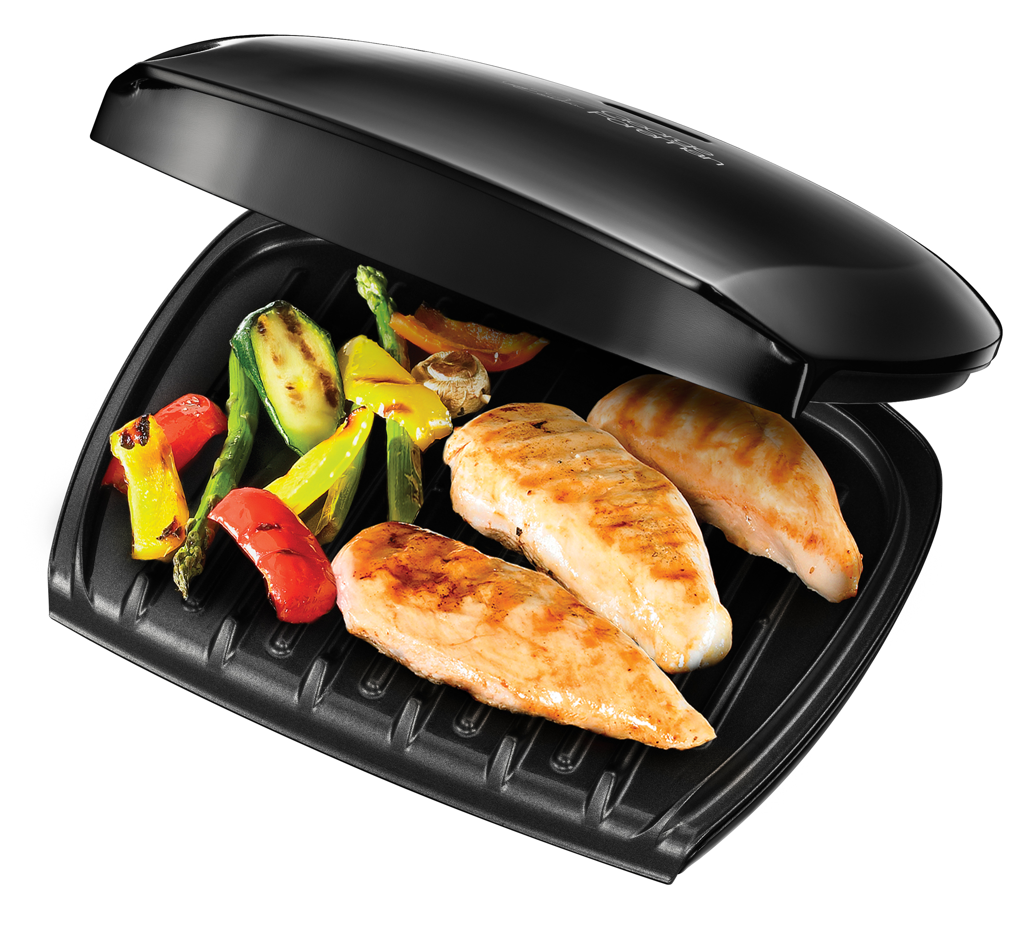 Der George Foremann Grill Family hat mit einer Grillfläche von 27 x 19 cm ausreichend Platz für bis zu fünf Portionen. Die bewegliche obere Grillplatte passt sich der Speisengröße an und sorgt so für beste Grillergebnisse. Die fixierten Grillplatten sind mit einer hochwertigen Antihaftbeschichtung ausgestattet und ermöglichen eine einfache Reinigung.