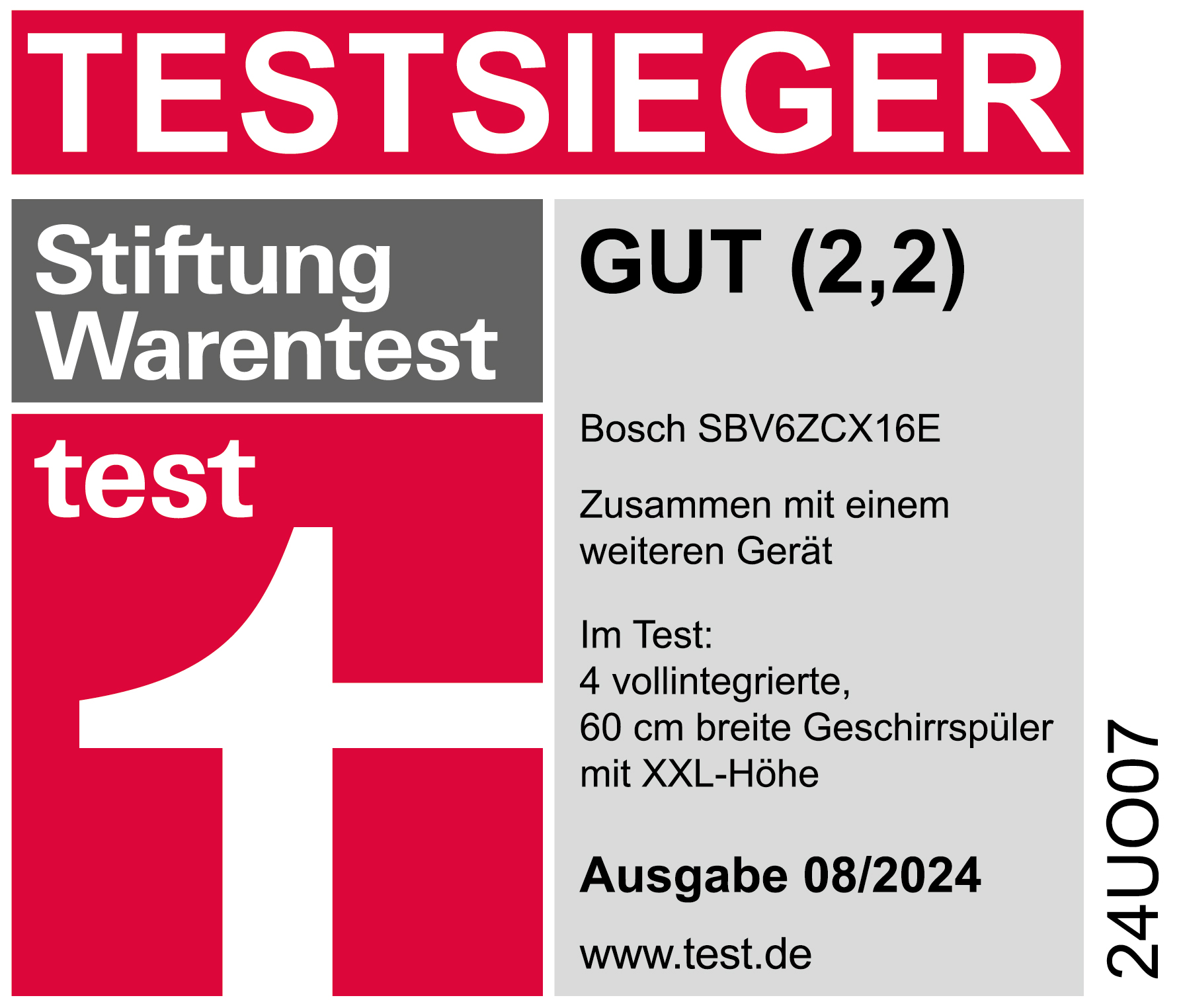 Die StiWa hat in ihrem aktuellen Geschirrspüler-Test erstmals auch fünf XXL-Modelle getestet und drei Testsieger gekürt. Einer davon ist der vollintegrierte Bosch Serie 6 Geschirrspüler SBV6ZCX16E. Mit nur 40 dB ist er besonders leise und erhält dafür ein „sehr gut“ (1,3). Die Jury lobt außerdem das Sparprogramm (Eco) und gibt die Note „gut“ (2,2).