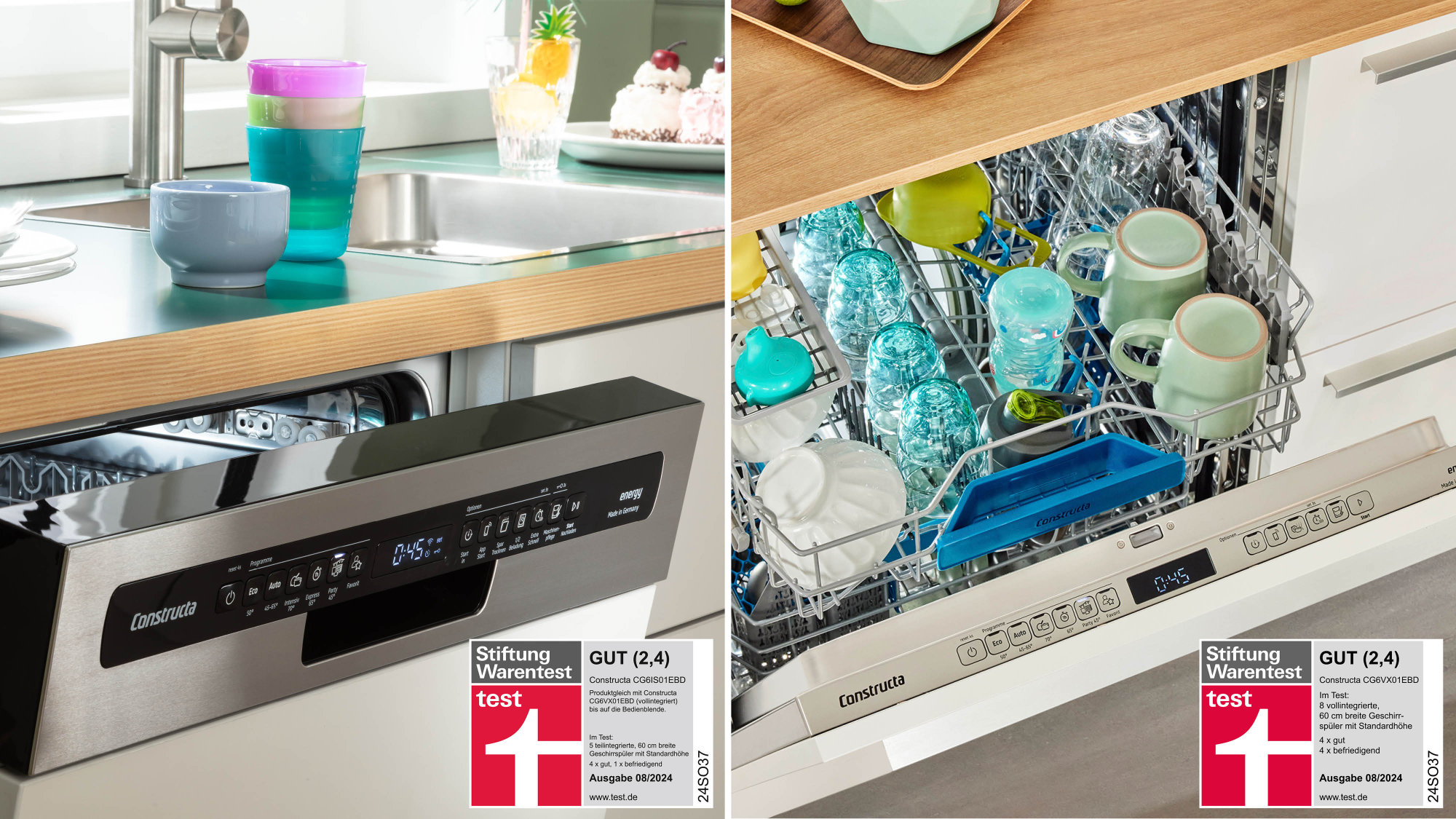 Beide Modelle sind „Made in Germany“ und zeichnen sich durch Features wie das schnelle 45-Minuten Party-Programm aus, die Intensive Clean Zone für stark verschmutzte Geschirrteile im Oberkorb oder den praktischen Flaschenhalter. Mit einem Betriebsgeräusch von 42 dB spült Constructa flüsterleise – das wurde von Stiftung Warentest für die Kategorie Geräusch mit „gut“ (1,8) honoriert.