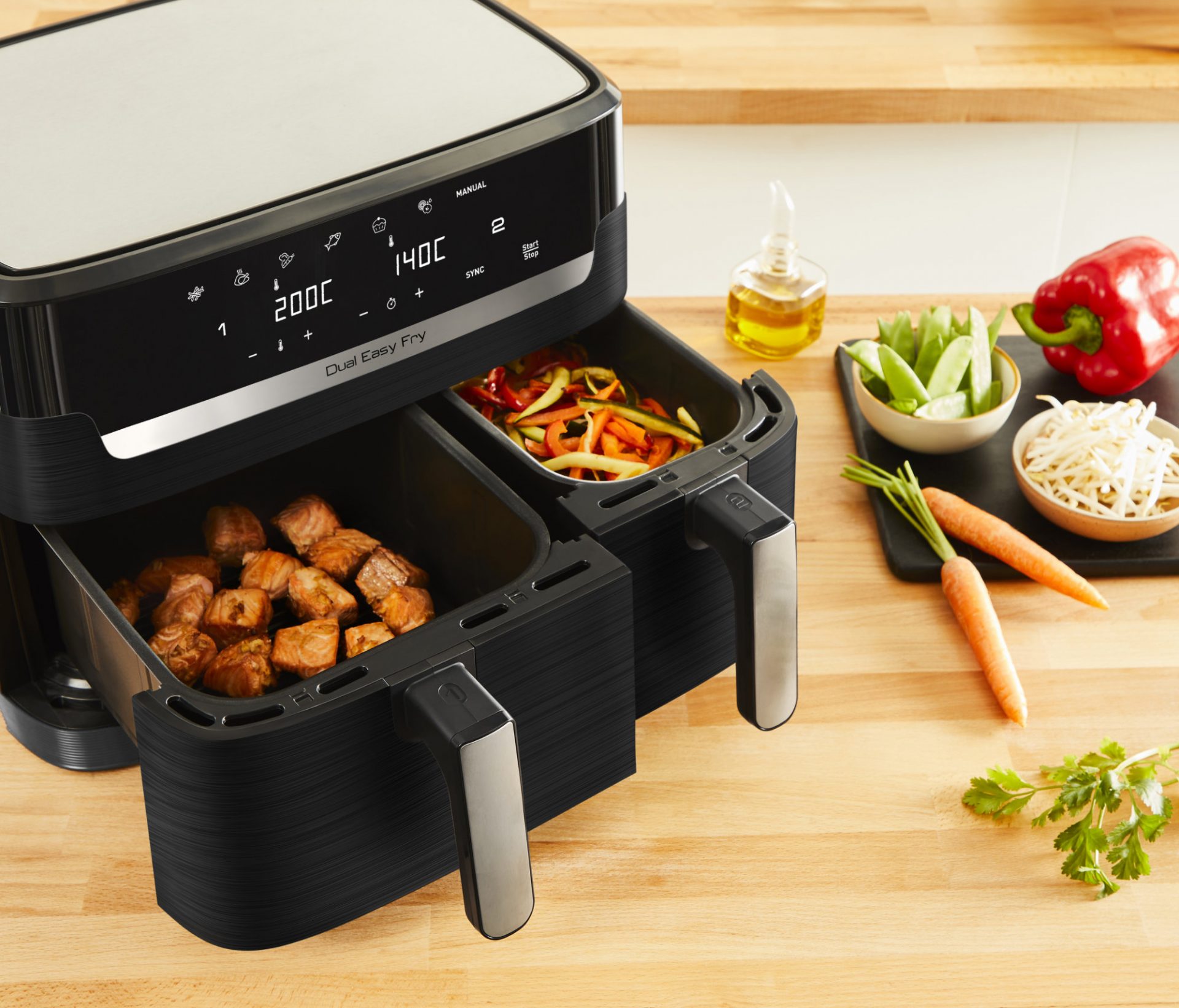 Die Dual Easy Fry & Grill kombiniert die besten Eigenschaften einer Heißluftfritteuse mit einem Grill. Ihre Dual-Zone-Technologie ermöglicht nicht nur eine gleichmäßige Hitzeverteilung, sondern auch die gleichzeitige Zubereitung verschiedener Gerichte. Das Gerät umfasst zwei Garkammern. Die Kammern können gleichzeitig mit unterschiedlichen Einstellungen genutzt werden und dank des Synchronisationsmodus sind trotzdem beide Gerichte gleichzeitig servierfertig.