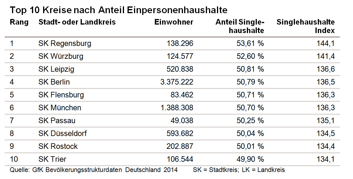 GfK: Top 10 Kreise nach Antei Einpersonenhaushalte