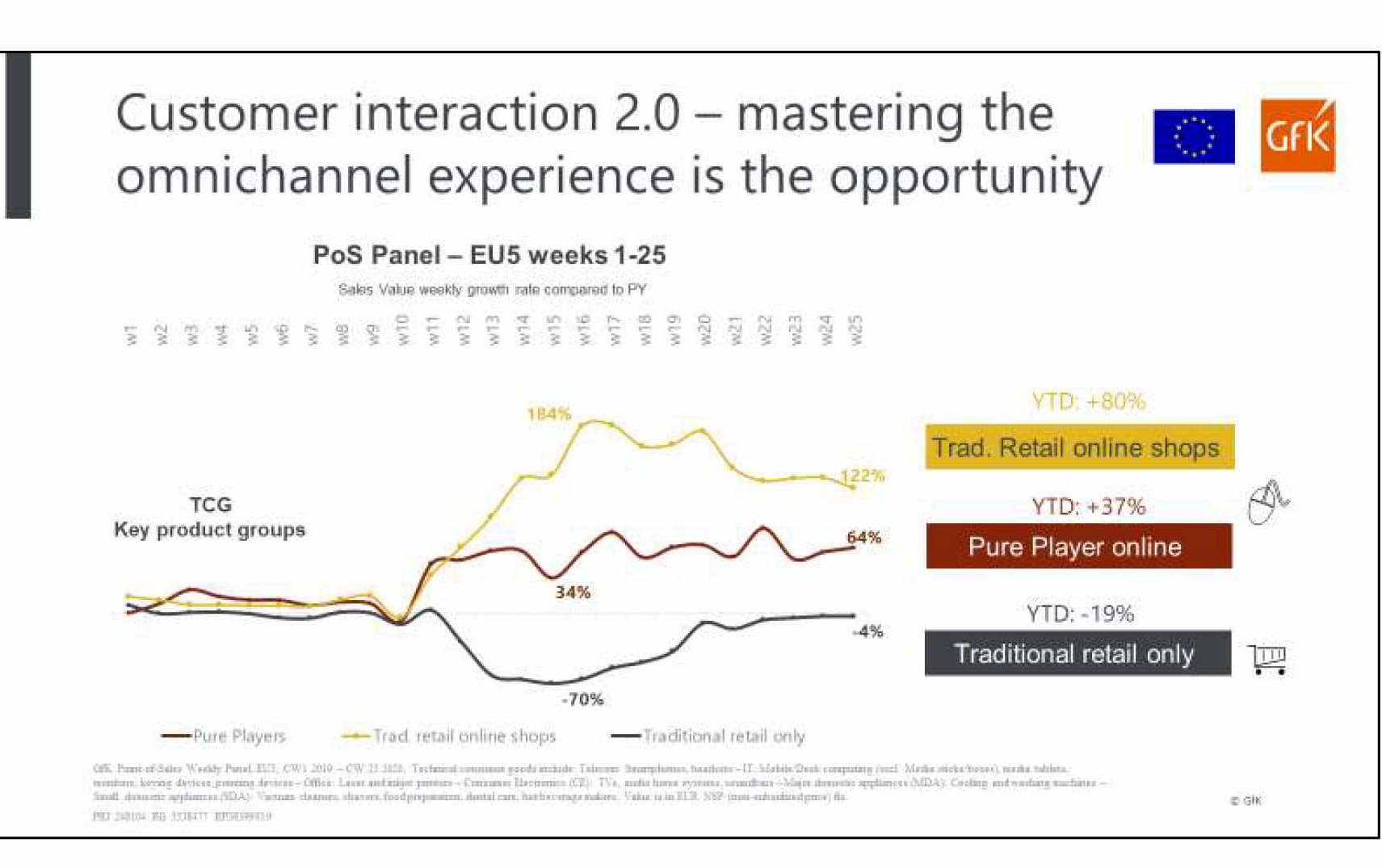 Aktuelle Daten von GfK zeigen, dass traditionelle Händler im Bereich technischer Konsumgüter während des Lockdowns von einem hohen Grad an Kundentreue profitiert haben. Dies gilt insbesondere für ihre Online-Shops, aber auch für die wiedereröffneten stationären Geschäfte. GfK Handelsexperten sehen darin einen Durchbruch für stationäre Händler mit Online-Präsenz.