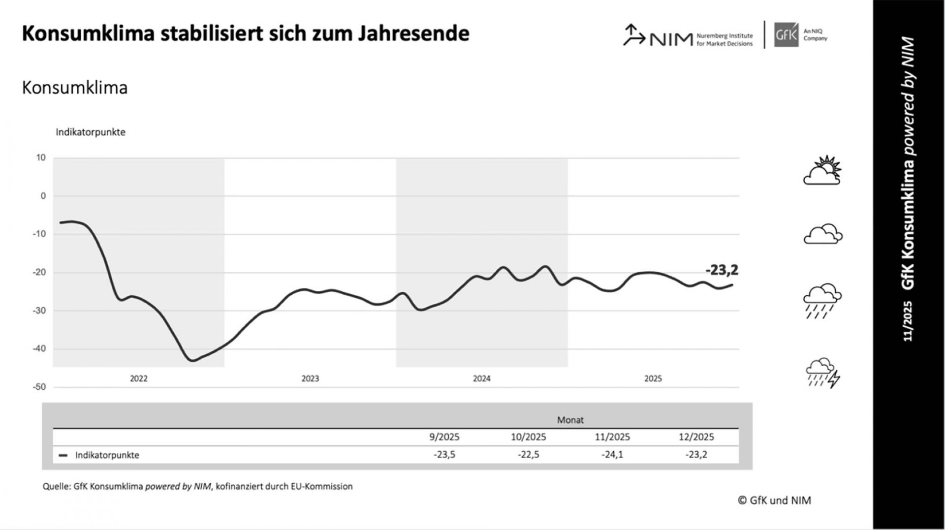 Zum Jahresende zeigt sich das Konsumklima in Deutschland leicht verbessert, bleibt jedoch insgesamt auf niedrigem Niveau. Der Konsumklimaindikator steigt im Dezember 2025 im Vergleich zum Vormonat um 0,9 Zähler auf –23,2 Punkte. Damit liegt die Verbraucherstimmung nahezu auf Vorjahresniveau. Dies geht aus der aktuellen Erhebung des „GfK Konsumklima powered by NIM“ hervor, das gemeinsam von NIQ/GfK und dem Nürnberg Institut für Marktentscheidungen (NIM) veröffentlicht wird.