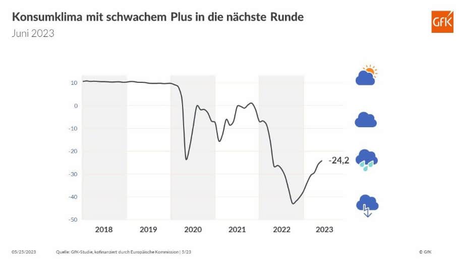 Während die Einkommenserwartung zum achten Mal in Folge zulegt, müssen sowohl Anschaffungsneigung als auch Konjunkturerwartung leichte Einbußen hinnehmen. Die Gesellschaft für Konsumforschung (GfK) prognostiziert für das Konsumklima für Juni -24,2 Punkte und damit 1,6 Punkte mehr als im Mai dieses Jahres (revidiert -25,8 Punkte). Dies sind Ergebnisse der GfK-Konsumklimastudie für Mai 2023.