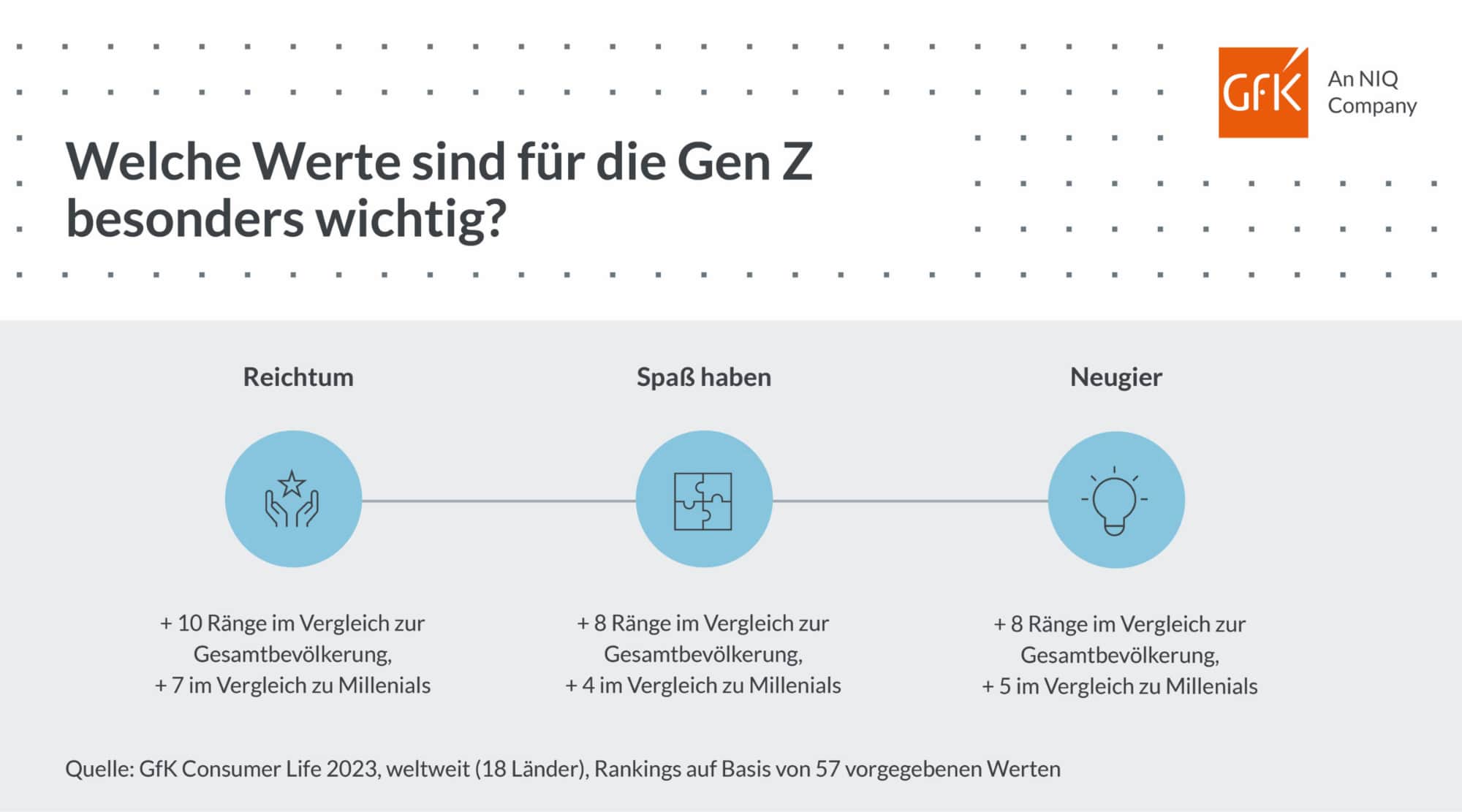 Darüber hinaus sind der Generation Z global ganz andere Werte wichtig als anderen Generationen. So rangiert das Streben nach materiellem Besitz für sie auf Platz 44 einer Liste von 57 Werten. Das sind zehn Ränge mehr als in der Gesamtbevölkerung. Auch Spaß zu haben steht für die Gen Z acht Ränge höher auf der Werteskala und belegt damit Platz 21.