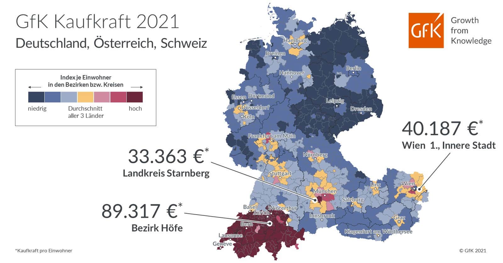 Eine aktuelle Kaufkraftstudie der GfK belegt deutliche Unterschiede des verfügbaren Nettoeinkommens in Deutschland, Österreich und der Schweiz.