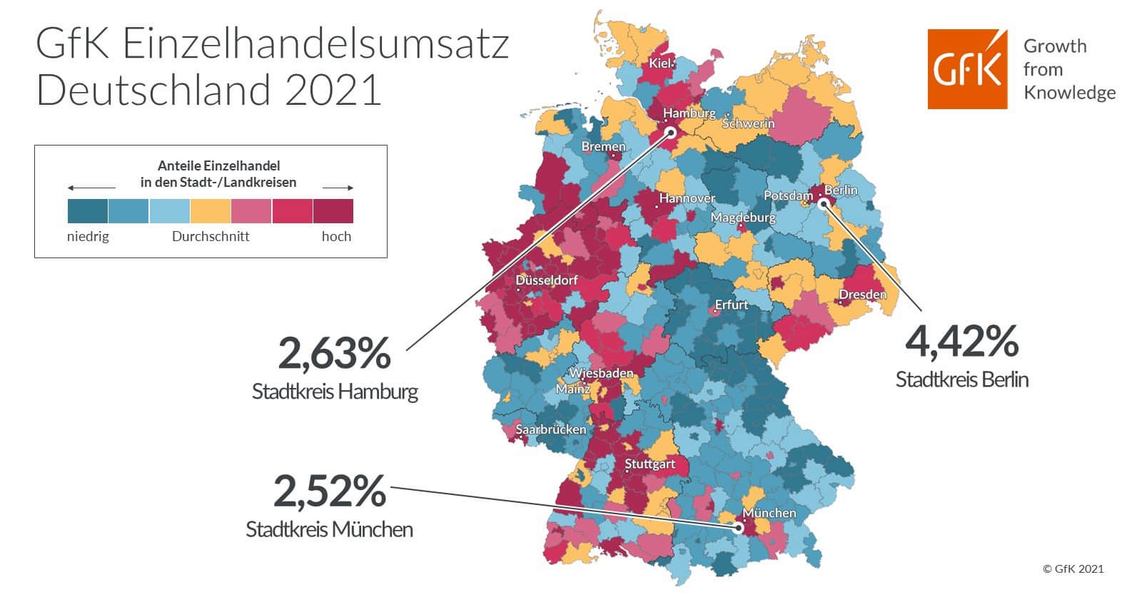 Im Vergleich zum revidierten Wert des Vor-Corona-Jahrs 2019 entspricht dies einem Anstieg von 12,3 Mrd. EUR und damit einem nominalen Plus von 2,9%. Die einwohnerstärksten deutschen Städte und Kreise Berlin (4,42%), Hamburg (2,63%) und München (2,52%) weisen dabei die höchsten Anteile am Gesamt-Handelsumsatz auf.