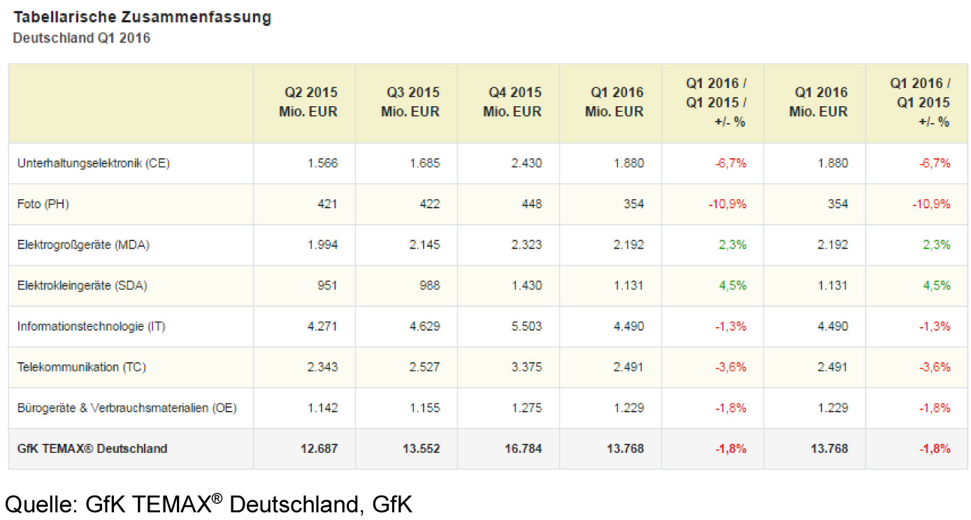 Der deutsche Markt für technische Gebrauchsgüter erzielte im ersten Quartal 2016 einen Umsatz von 13,8 Milliarden Euro. Das entspricht einem leichten Rückgang von 1,8 Prozent im Vergleich zum Vorjahreszeitraum. In fünf von sieben Bereichen – Unterhaltungselektronik, Foto, Informationstechnologie, Telekommunikation, Bürogeräte und Verbrauchsmaterial – gingen die Umsätze zurück. Mit minus 10,9 Prozent hatte der Bereich Foto die größten Einbußen zu verzeichnen. Deutlich positive Umsätze verzeichneten dagegen Elektrogroß- und Elektroklein-Geräte.