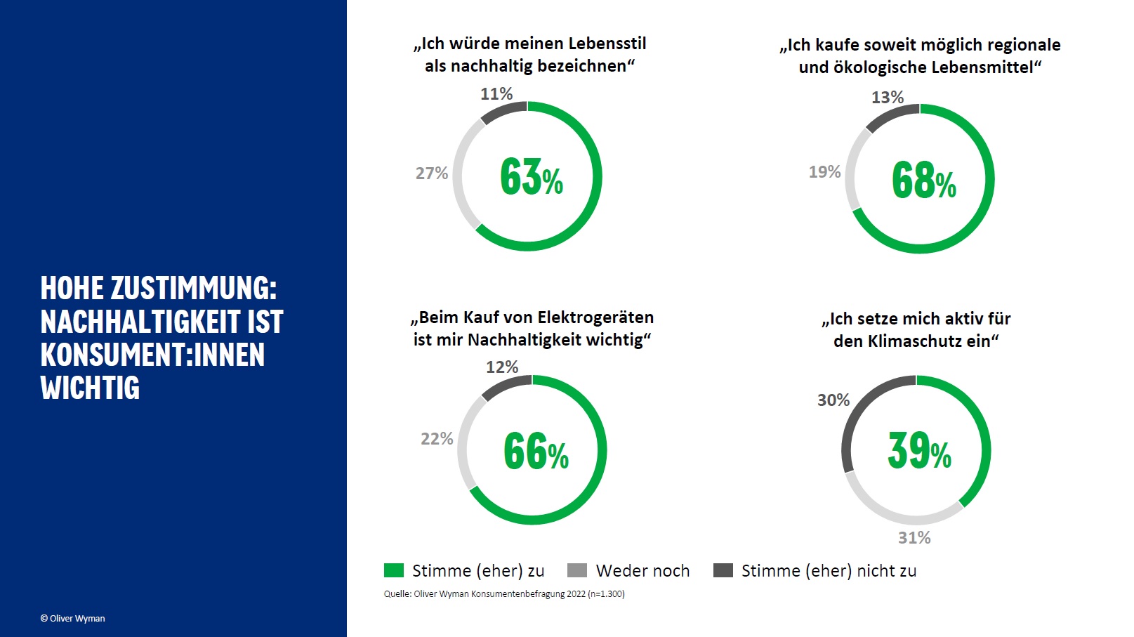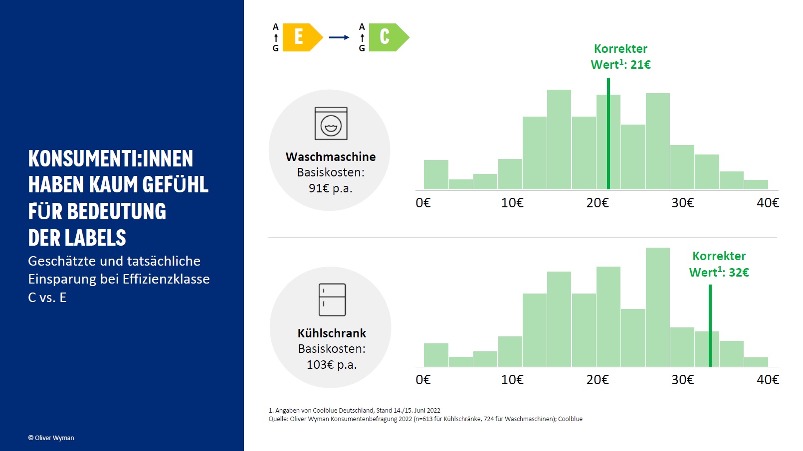 Für die Herstellergarantie, dass ein Gerät repariert werden kann und nötige Ersatzteile zur Verfügung stehen, akzeptieren Verbraucher einen Preisaufschlag von 25%. „Die Zahlungsbereitschaft der Verbraucher ist vor allem dann höher, wenn sie auch selbst einen finanziellen Vorteil haben. Gerade für eine Waschmaschine oder einen Kühlschrank sind sie durchaus bereit, 200 Euro mehr auszugeben, wenn sie dafür ein Gerät der Energieeffizienzklasse C statt E erhalten“, erläuterte Dr. Martin Schulte, Partner und Konsumgüterexperte bei Oliver Wyman.