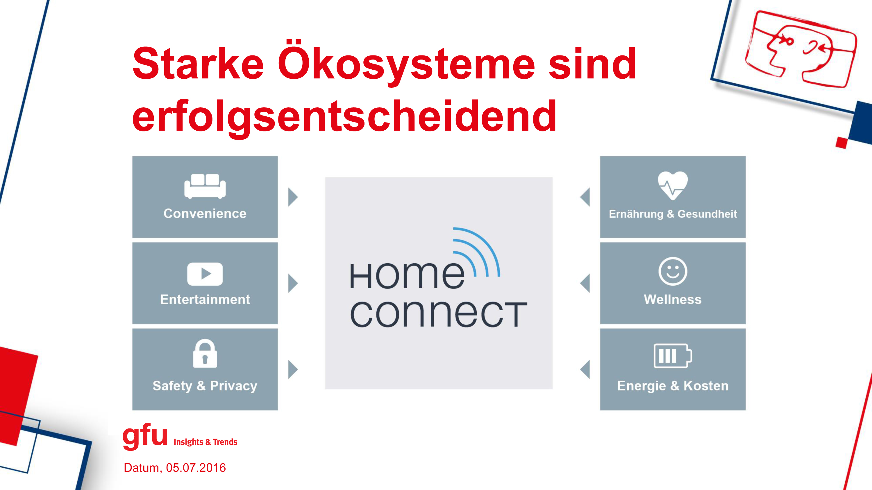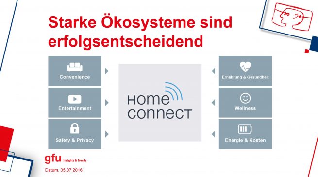 Seiner Meinung nach müssen sich „Ökosysteme“, die auf einer offenen Plattform basieren, – beispielsweise auf der BSH Lösung Home Connect – neu herauskristallisieren. “Nur so entstehen innovative Geschäftsmodelle und Dienstleistungen rund um die Themen Gesundheit, Energiemanagement oder Sicherheit. „Diese Ökosysteme helfen, den Trend durchzusetzen“, ist sich Hagenbucher sicher.