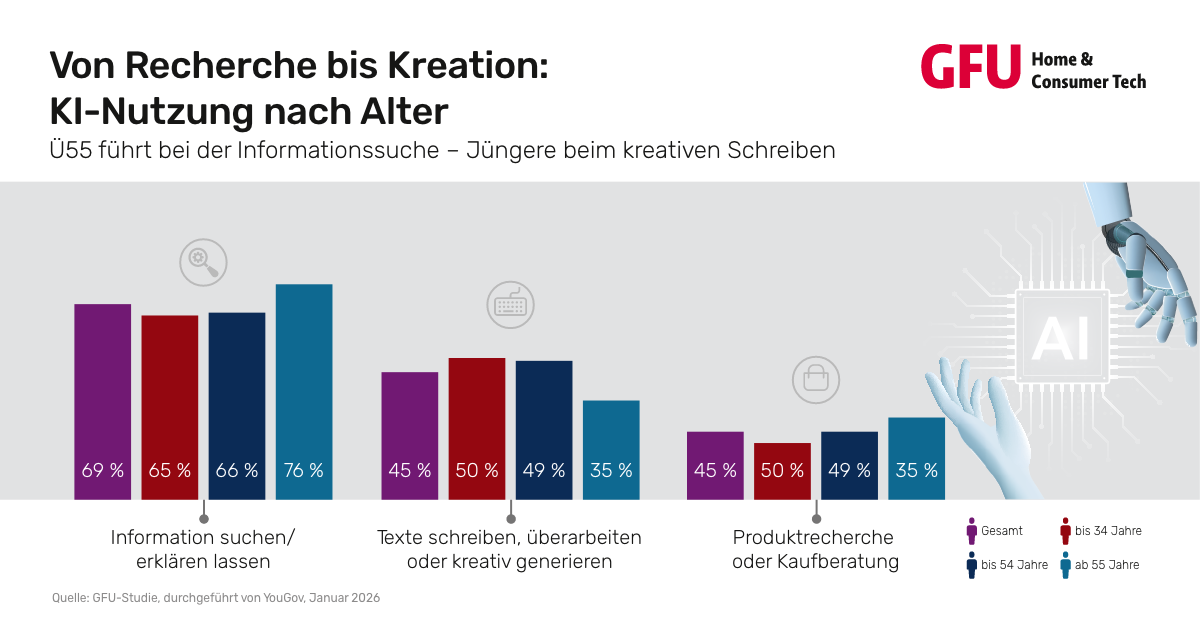 Der wichtigste Anwendungsfall für KI-Modelle ist die Informationsbeschaffung: Rund 69 Prozent der regelmäßigen Nutzer greifen hierfür auf KI-Chatbots zurück. Während ältere Befragte (55+) KI vor allem als Wissensquelle schätzen (76 Prozent), verwenden jüngere User die Technologie verstärkt zur Texterstellung und für kreative Aufgaben. Anwendungen wie Bild-, Video- oder Audiogenerierung sowie Datenanalyse und Programmierung spielen bislang eher eine nachgeordnete Rolle. Auch Produktrecherche und Kaufberatung werden aktuell nur von etwa einem Viertel der Befragten über KI genutzt.