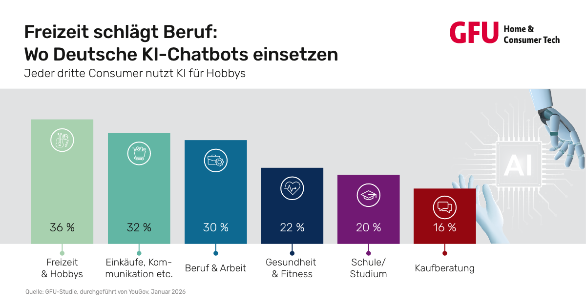 KI-basierte Chatbots sind für einen Großteil der Bevölkerung in Deutschland bereits fester Bestandteil des Alltags. Das zeigt eine aktuelle, von YouGov durchgeführte Umfrage im Auftrag der GFU Consumer & Home Electronics GmbH unter 2.002 Teilnehmenden, die Carine Chardon, Geschäftsführerin der GFU Consumer & Home Electronics GmbH, am vergangenen Freitag im Rahmen eines Kamingesprächs exklusiven Medienvertretern vorgestellt hat.