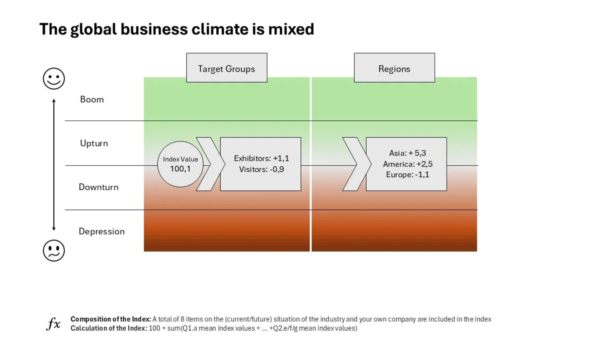 Trotz der angespannten Gesamtlage bewerten viele Unternehmen ihre eigene Geschäftsentwicklung positiver als die der Branche insgesamt. In den kommenden sechs Monaten erwarten 42 Prozent der Aussteller eine Verbesserung oder zumindest Stabilität der eigenen Lage, während fast die Hälfte eine Verschlechterung der Branchenentwicklung prognostiziert. Auch in Europa überwiegt beim Blick auf das eigene Unternehmen ein vorsichtiger Optimismus.