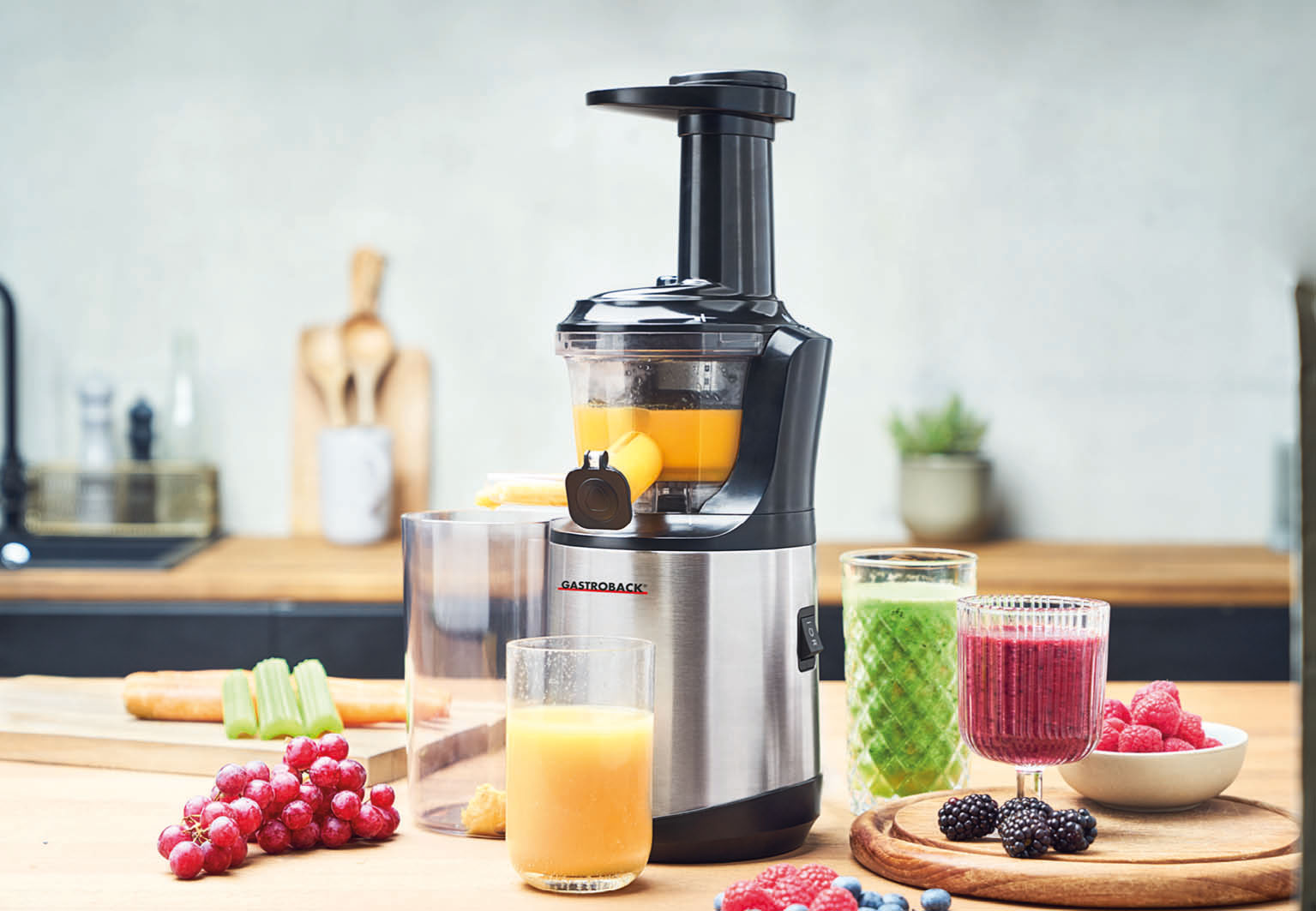 Mit Säften und Smoothies kehrt auf jeden Fall verloren gegangene Energie in Form Vitaminen und Mineralstoffen zurück. Wer Obst und Gemüse selbst entsaftet, der weiß genau, was darin enthalten ist. Der „Slow Juicer Advanced Vital“ im modernen und platzsparenden Gehäuse aus Edelstahl beispielsweise steht für ein schonendes Entsaften dank geringer Drehzahl. Der 150 Watt Motor mit 70 Umdrehungen/min ist besonders leise und treibt die kraftvolle Press-Schnecke mit verstärktem Edelstahlkern an. Diese holt dann das Beste aus allen Obst- und Gemüsesorten, Beeren, Blattgemüse, Gräser, Wildkräuter und sogar Sprossen. Das Schöne ist: Man trinkt nur die reinen Zutaten in Form von Frucht, Gemüse oder grünen Blättern – frei von Industriezucker oder anderen Zusatzstoffen.