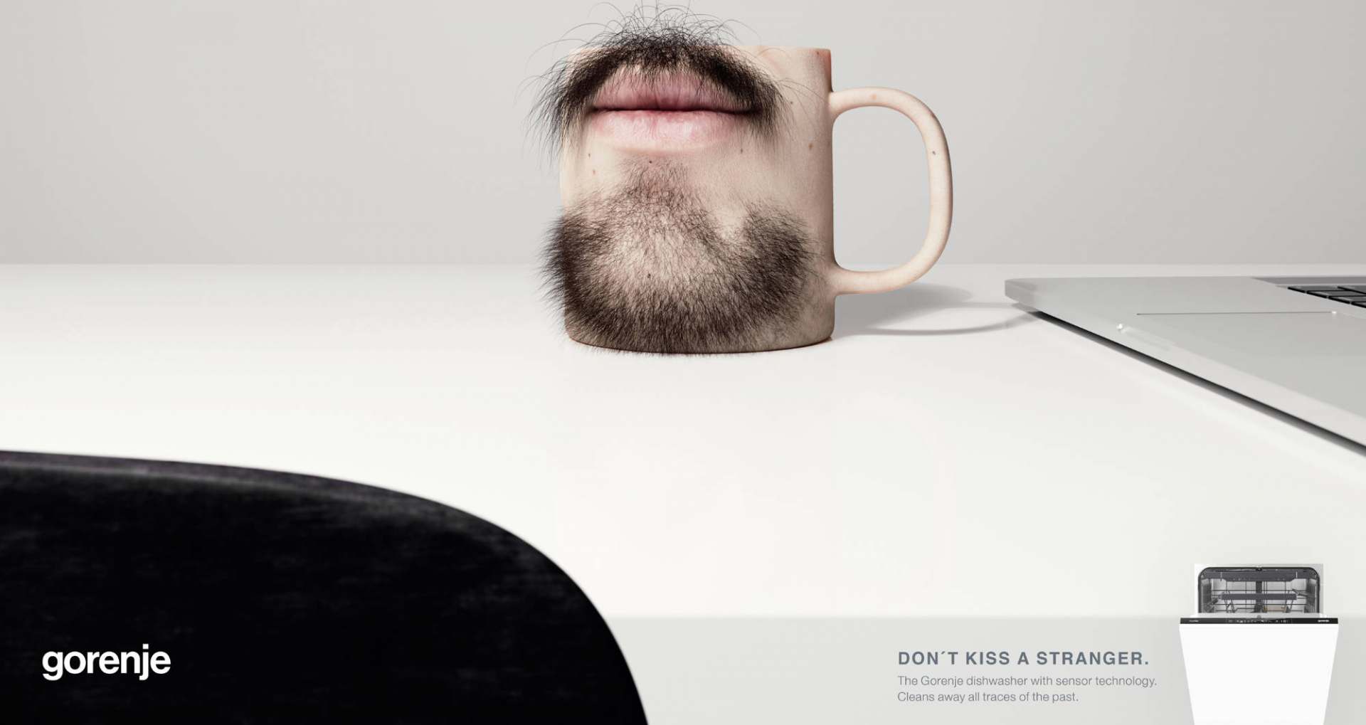Drei Printmotive bewerben die intelligente Sensortechnologie der Gorenje Geschirrspüler, die den Verschmutzungsgrad exakt ermittelt und den Spülvorgang dementsprechend anpasst – damit immer gewährleistet ist: „Don’t kiss a stranger“.