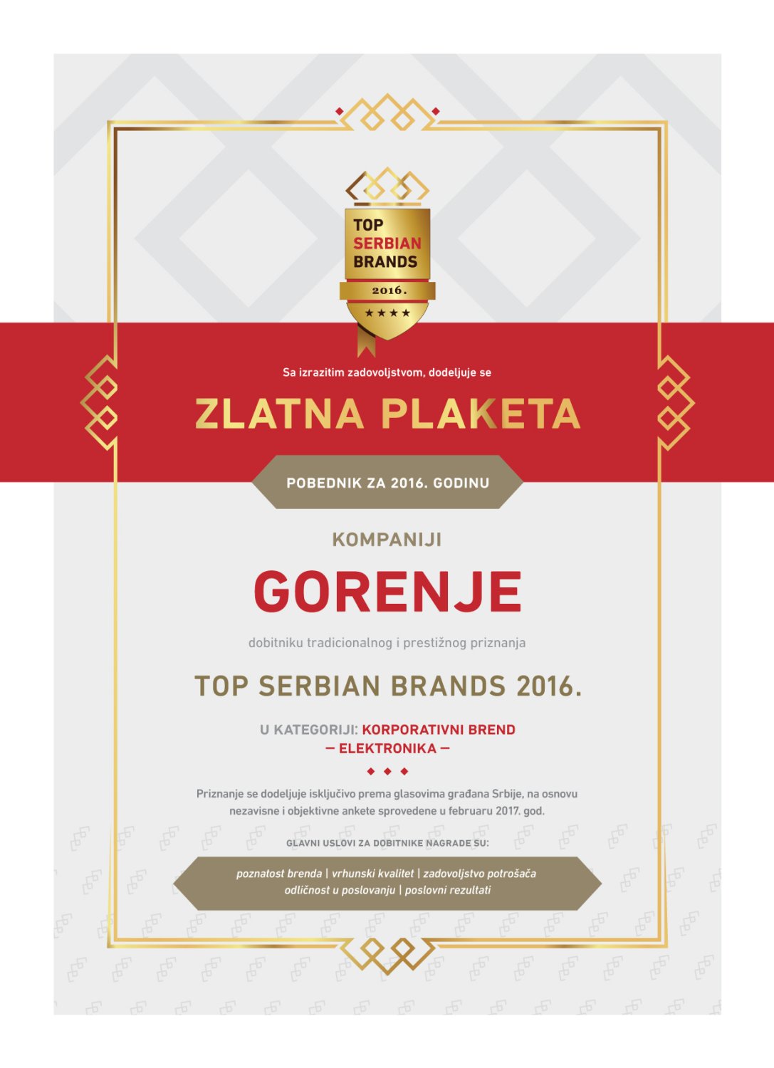 Gorenje hat in Serbien die Auszeichnung “Top Serbian Brands 2016” erhalten und gilt damit jetzt als die beliebteste Elektromarke unter serbischen Nutzern im Jahr 2016. Hauptkriterien für den Award sind die Faktoren Marken-Wiedererkennung, Top-Qualität der Produkte, Kundenzufriedenheit und Geschäftsergebnisse.
