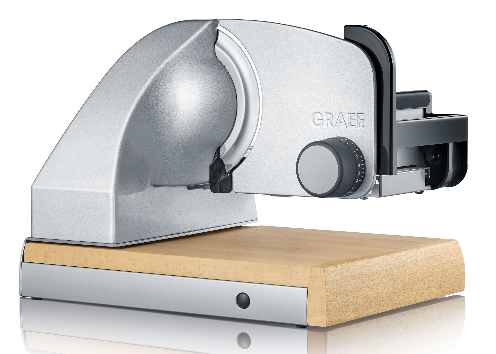 Der Allesschneider aus der SlicedKitchen Serie von Graef ist ein Vollmetallgerät, das freitragend über dem Auffangtablett schwebt. Der wartungsfreie 170-Watt-Kondensatormotor lässt die 170 mm breiten, durchgehärteten Vollstahlmesser flüsterleise rotieren. Mit Hohlschliff verarbeiten sie Fleisch, Brot, Wurst, Schinken, Käse oder andere Lebensmittel zu hauchdünnen Scheiben. Die Schnittstärke lässt sich aber auch auf bis zu 20 mm einstellen.