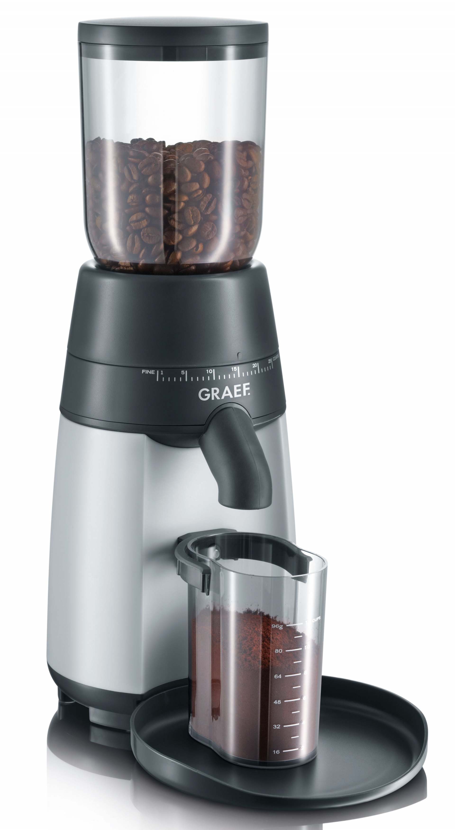 Die Graef CM 70 Kaffeemühle verfügt über ein langsam laufendes Kegelmahlwerk aus Edelstahl mit 24 Mahlgradeinstellungen. Durch den Kontaktschalter am Siebträgerhalter wird die gewünschte Menge Kaffeemehl direkt frisch in den Siebträger gemahlen. Der Kaffeebohnenbehälter für ca. 250 g Bohnen und die Bodenplatte lassen sich zur leichten Reinigung einfach abnehmen.