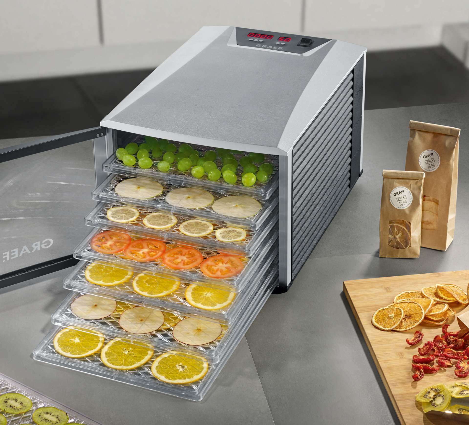 Der Graef Dörrautomat DA 508 ist auch als DA 510 erhältlich. Beide Geräte verfügen über acht bzw. zehn Einschübe und erlauben es damit, noch mehr Lebensmittel in einem Arbeitsgang zu dörren.
