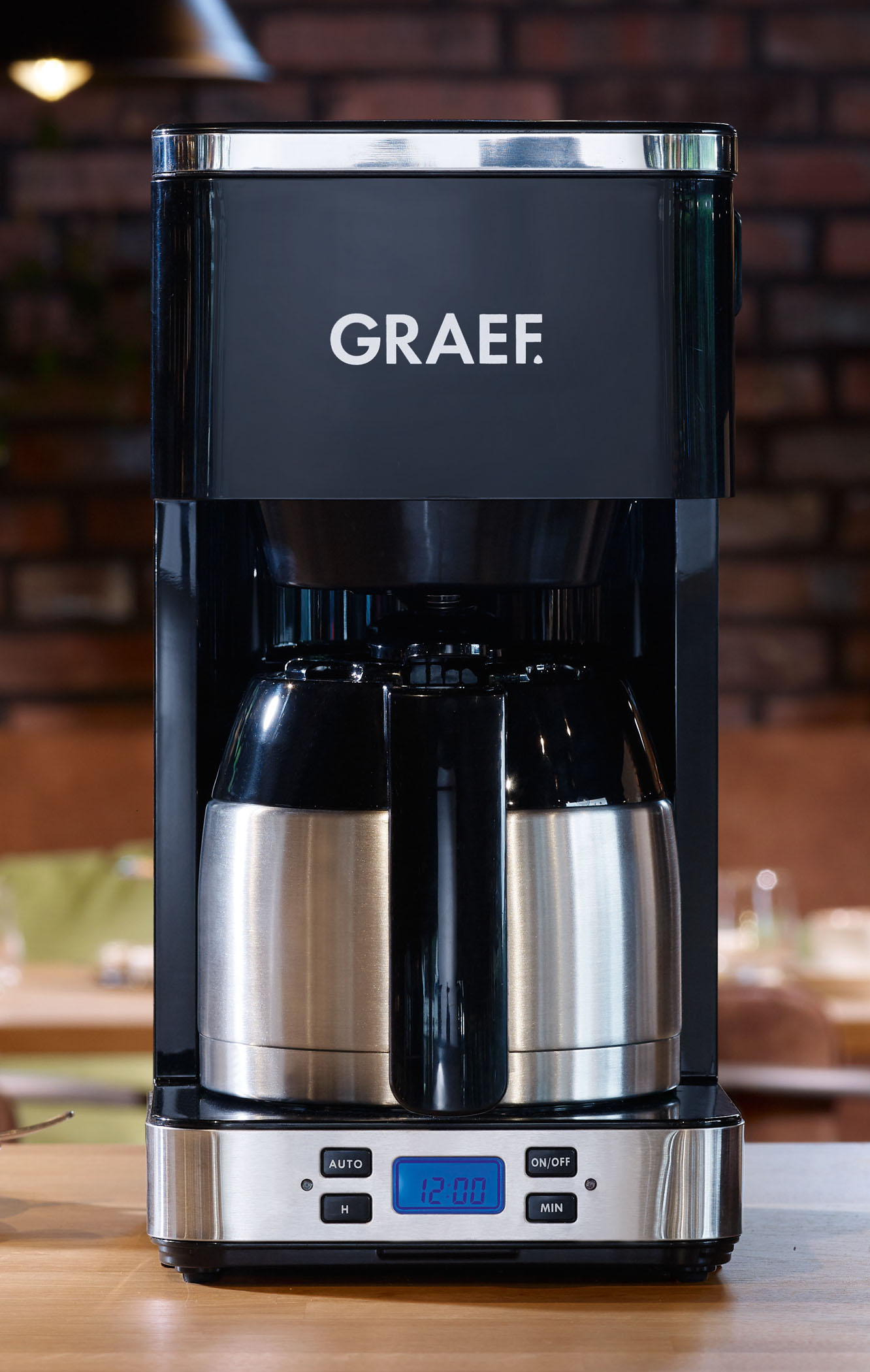 Die Graef Filterkaffeemaschine FK 500 ist in den Varianten FK 502 mit Glaskanne und FK 512 mit Thermokanne erhältlich. Beide Geräte lassen sich einfach bedienen und vorprogrammieren.