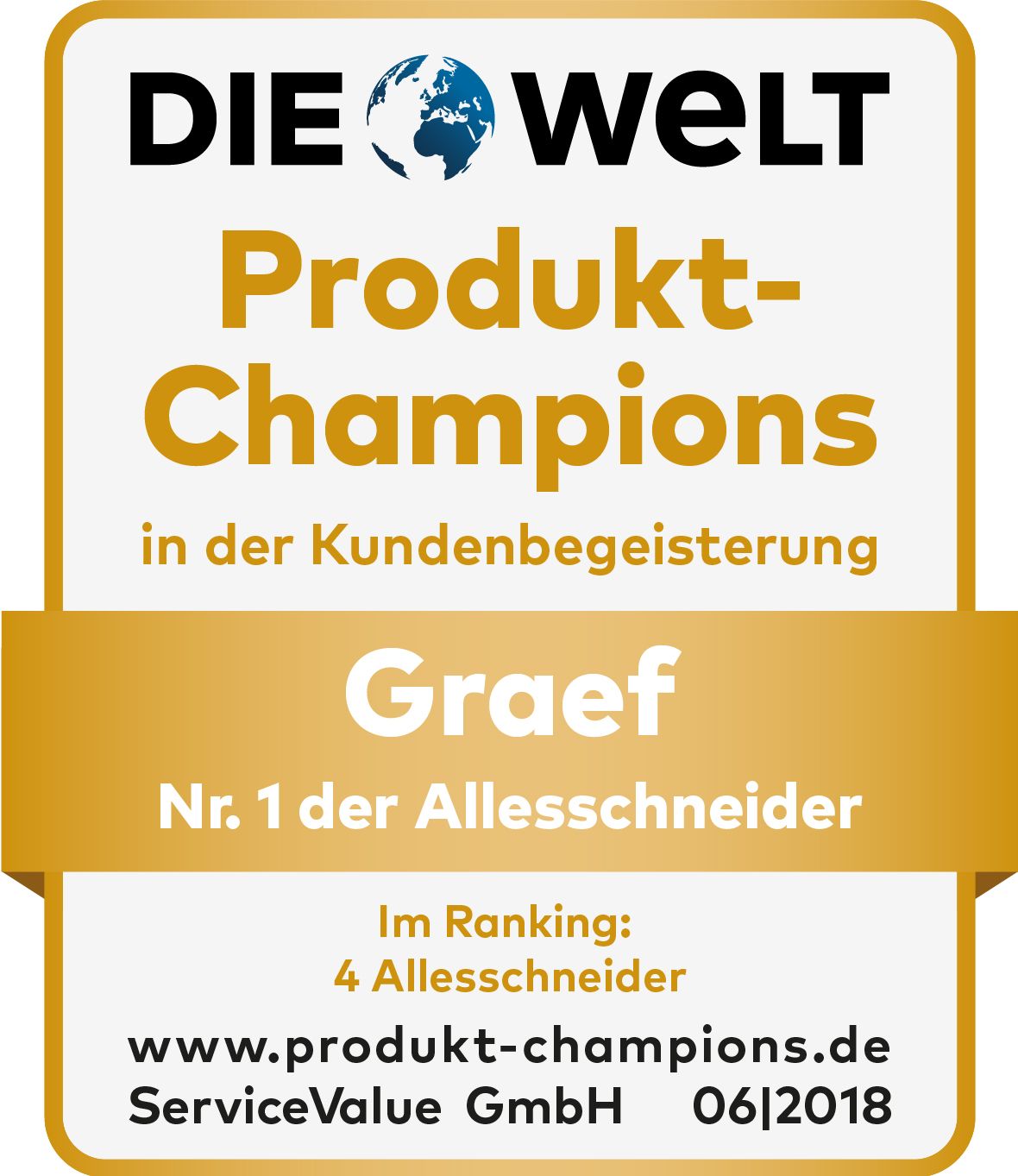Die Produkte von Graef überzeugen. In einer Analyse hat die Beratungsgesellschaft Servicevalue in Kooperation mit der Tageszeitung „Die Welt“ ermittelt, welche Unternehmen und Marken ihre Kunden durch die Qualität ihrer Produkte begeistern. Hier setzt sich Graef durch und geht als „Produkt-Champion 2018“ in der Kategorie „Allesschneider“. Graef liegt damit in den Top 100 der insgesamt 2.246 Anbieter.