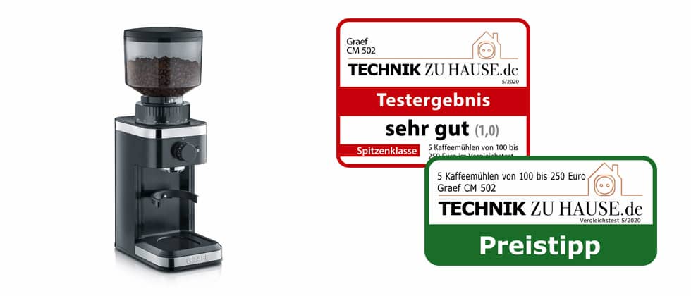 Damit Kaffee seine Aromen optimal entfalten kann, ist die Zubereitung von großer Bedeutung – und die beginnt mit dem Mahlen der Bohnen. Im aktuellen Vergleichstest von „Technik zu Hause“ (Ausgabe 5/2020) von fünf Kaffeemühlen der Preisklasse 100 bis 250 EUR konnte jetzt die Kaffeemühle CM 502 von Graef durch die Bank weg überzeugen. Bestnoten von 1,0 in den Bereichen Funktion, Bedienung, Ausstattung und Verarbeitung führten zu einer glatten Punktlandung: 1,0 (sehr gut) im Testergebnis. Zusätzlich sicherte sich die Kaffeemühle im geradlinigen Graef-Design die Testjury-Empfehlung „Preistipp“.