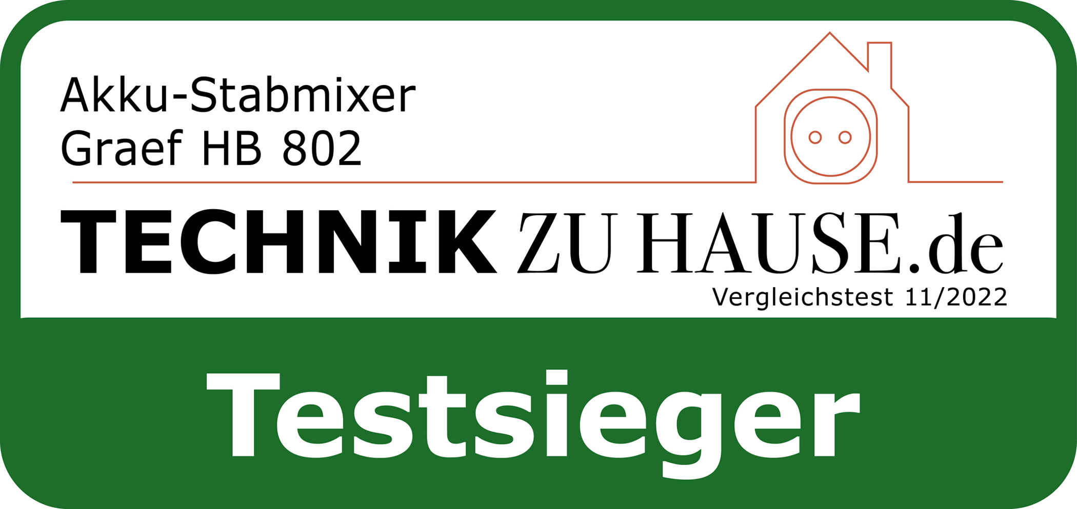 Der erste kabellose Stabmixer aus dem Hause Graef punktete vor allem durch seinen Akkuantrieb. „Ist der Stabmixer mit Power versorgt, kann die Arbeit ohne ein störendes Kabel beginnen.“ Im Praxistest mit verschiedenen Lebensmitteln überzeugte der Stabmixer HB 802 durch Leistung: „Unsere Möhren sind ruckzuck gleichmäßig fein püriert. Ein sehr gutes Ergebnis sehen wir auch beim Smoothie und beim Sahneschlagen“, so die Redaktion.