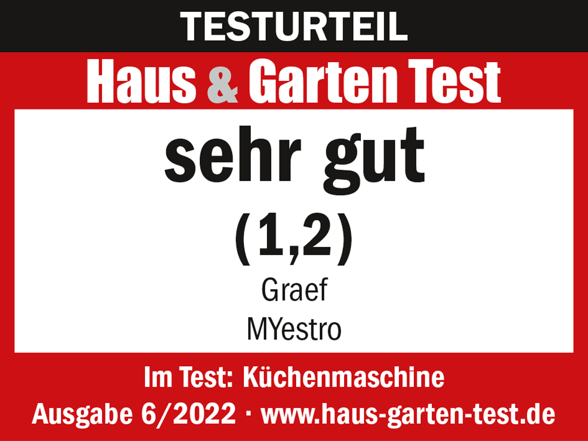 Die „Haus & Garten Test“-Redaktion verleiht der Küchenmaschine MYestro und dem Akku-Stabmixer HB802 von Graef jeweils die Note „sehr gut“ (1,2). Der kabellose Betrieb und das umfangreiche Zubehör machen den Stabmixer zum Testsieger.