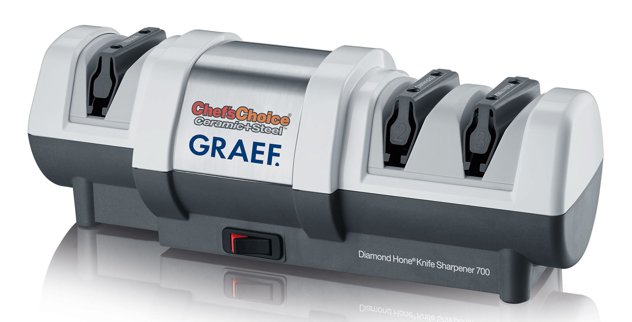 Der Graef Messerschärfer CC250 stellt die ursprüngliche Schärfe der Messer wieder her. Dabei er CC 250 als erstes Gerät auf dem Markt sowohl herkömmliche Stahl-, Asia- als auch Keramikklingen.