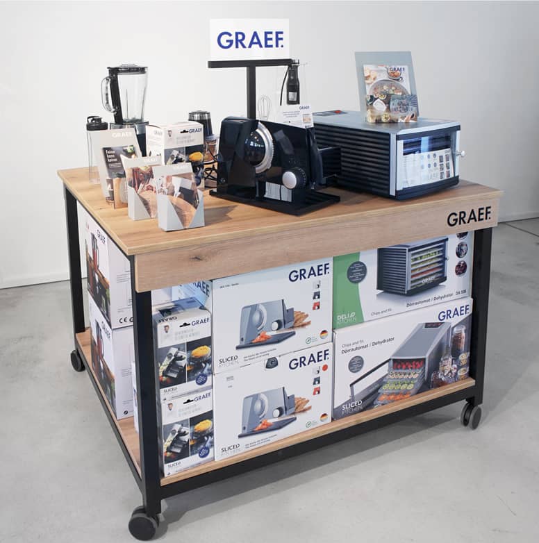 Flexibilität am PoS, spannende Neuheiten und starke Verkaufsargumente: Graef unterstützt den stationären Handel mit neuen, hochwertigen PoS-Möbeln und passgenauen Lösungen für die Verkaufsflächen. Die neue Kopfgondel sowie ein neuer, spezieller Tisch für die Graef Themenwelt punkten mit platzsparendem Design und hochwertiger Verarbeitung. Das schlichte Design der Möbel lässt sich in jede Umgebung integrieren und holt das Maximale aus jeder Verkaufsfläche heraus.