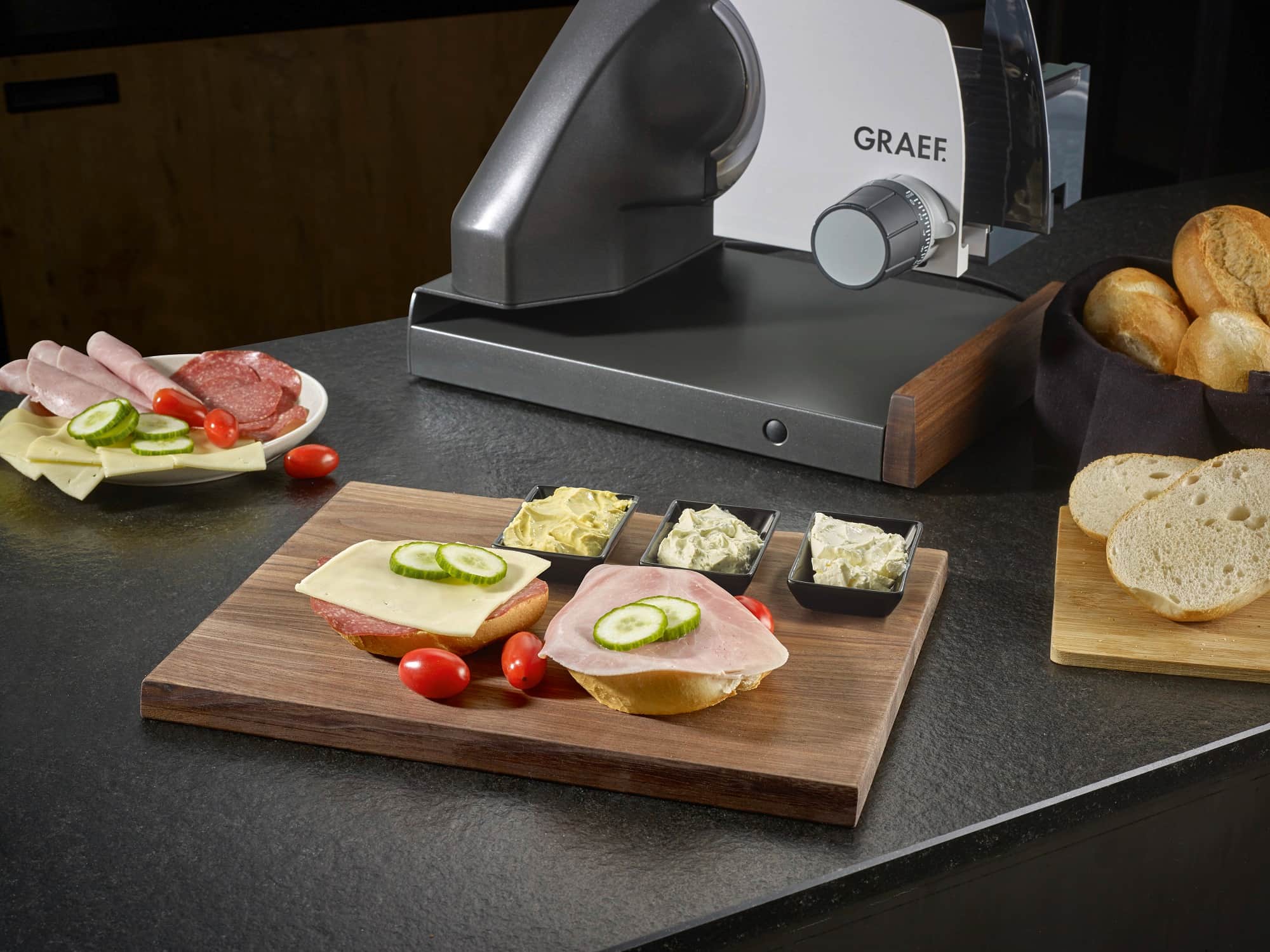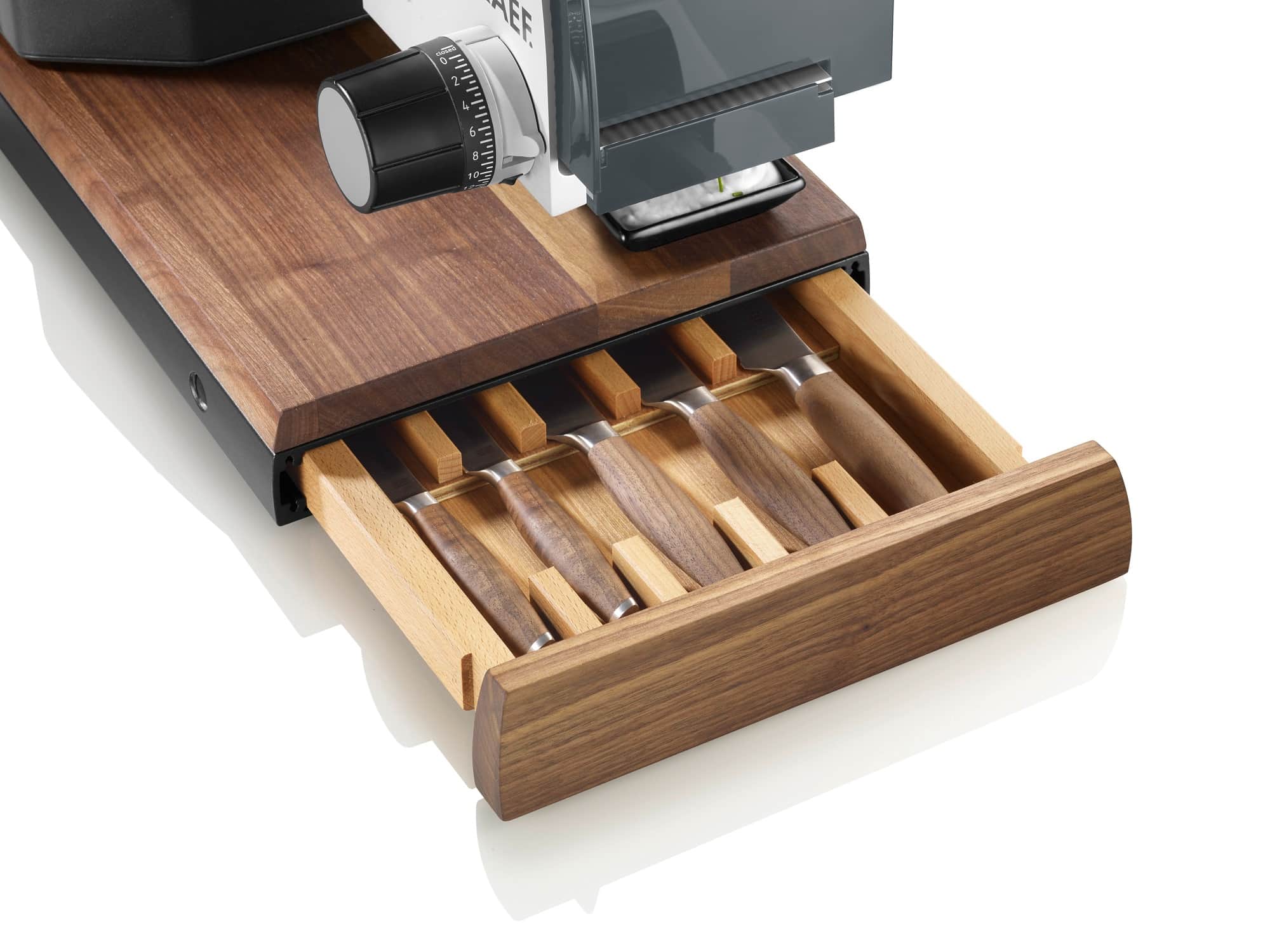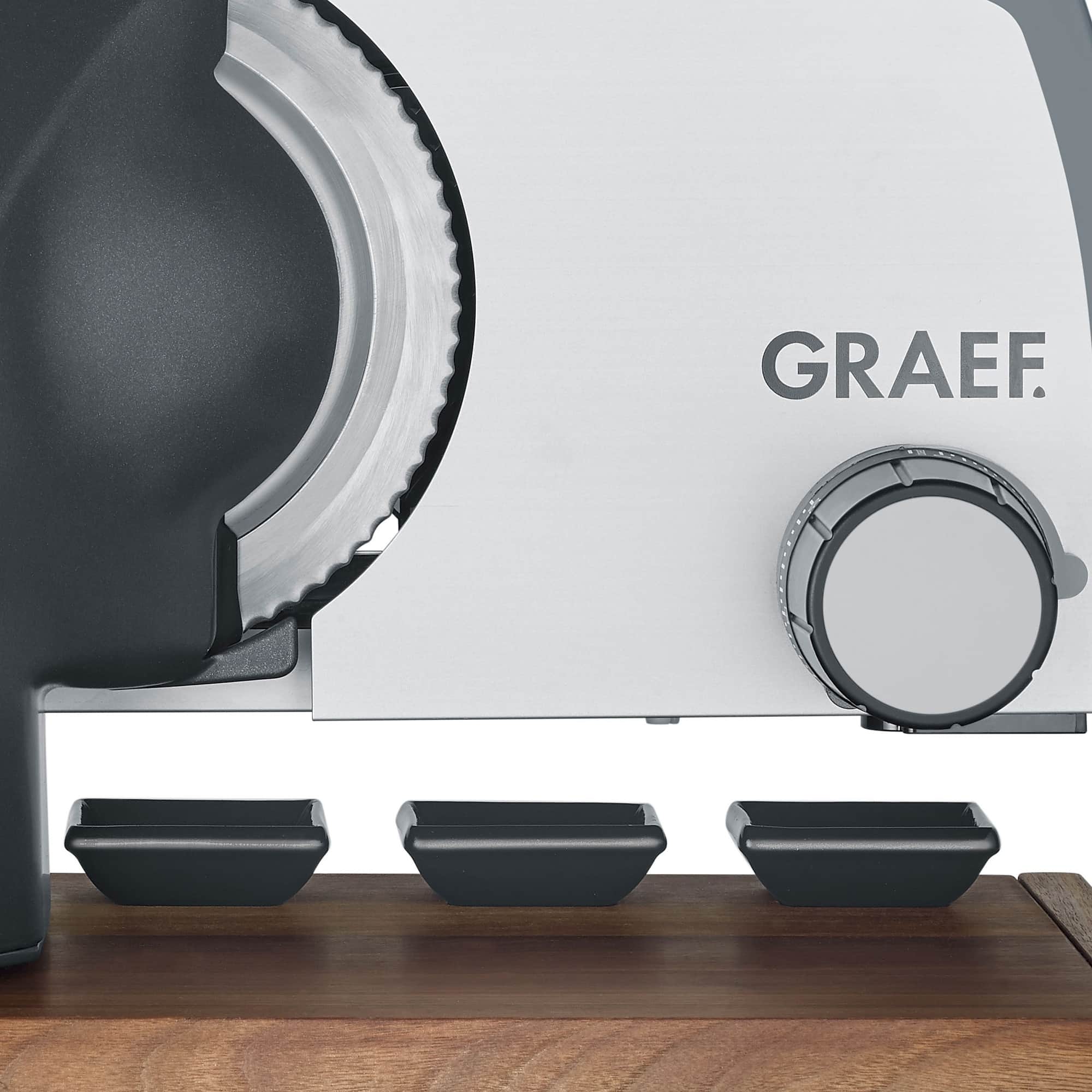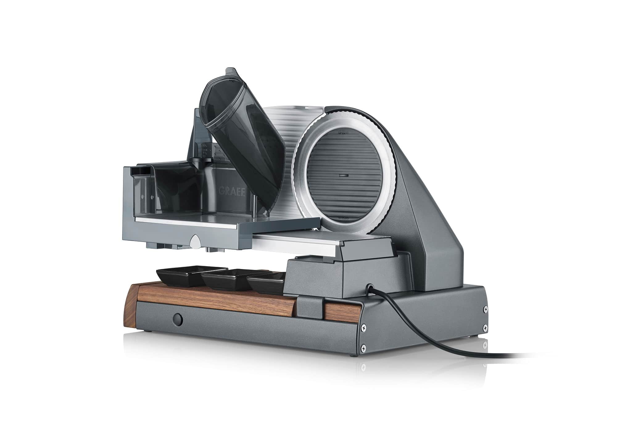 Ein besonderes Feature ist die integrierte Messerschublade, in der Küchenmesser sicher und schnell griffbereit aufbewahrt werden können. Highlight ist das extragroße Schneidebrett aus edlem Walnussholz mit drei eingelassenen Dipschalen, das zum stilvollen Anrichten einer Brotzeit genutzt werden kann. Zur Ausstattung gehören natürlich die typischen Merkmale der Graef-Schneider wie die zentrale Bedieneinheit mit dem eloxierten Aluminiumanschlag sowie die vierfache Kindersicherung.