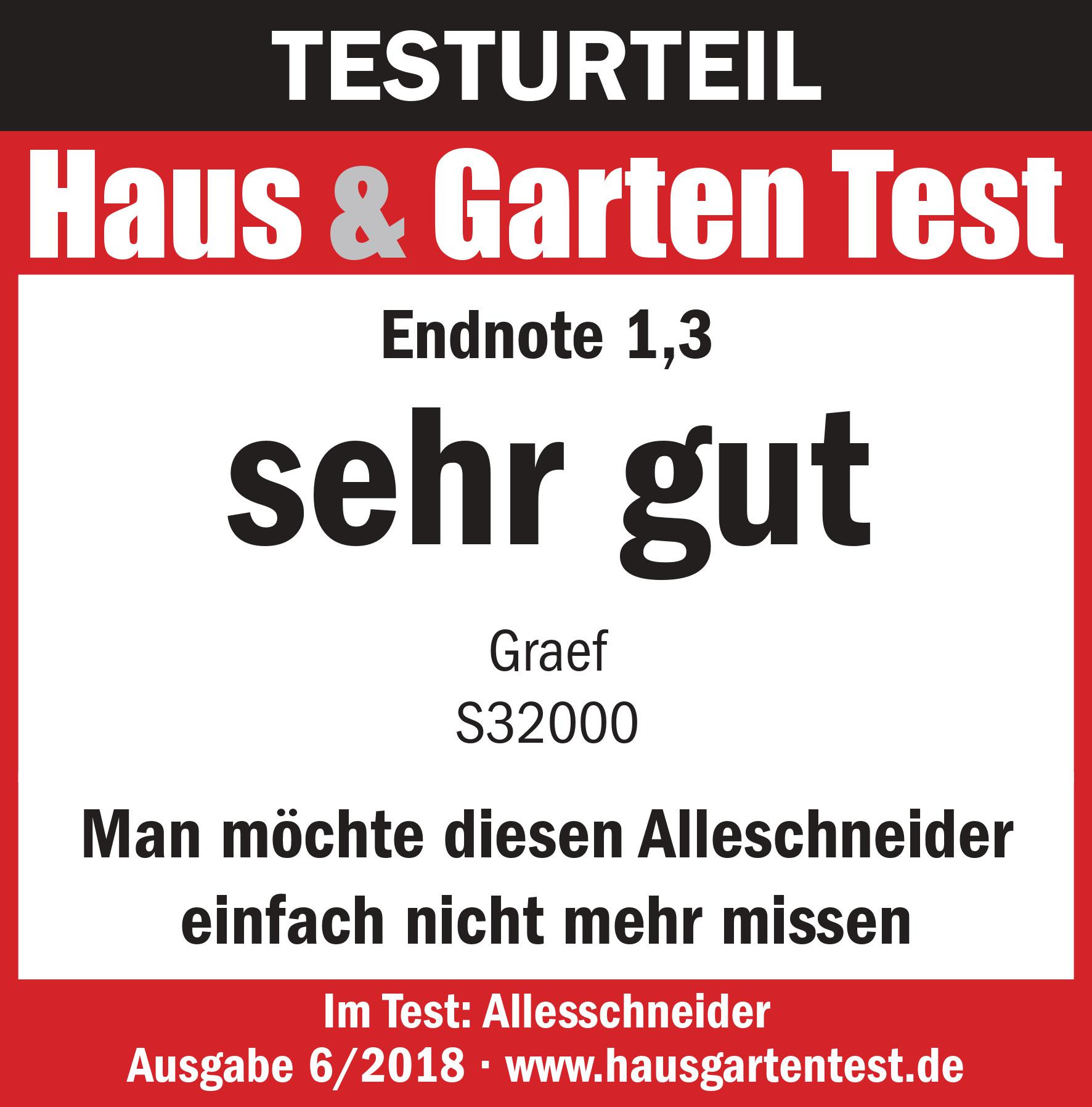 Die Funktion des S32000 wurde mit einem Schnitttest geprüft. Bei frischem Brot haben sich weder Fransen noch eine Abrisskante erkennen lassen. Auch bei Salami und Schinken hat der Allesschneider den Schnitttest bestanden. Selbst Tomaten lassen sich gleichmäßig und leicht schneiden. Dabei hat der von Graef entwickelte MiniSlice Aufsatz überzeugt, weil sich mit ihm sogar kleines Gemüse gefahrlos in feine Scheiben schneiden lässt. Durch die Schwerkraft fällt das Schnittgut in einem Rohr gegen das rotierende Messer. In der Handhabung haben sich die wenigen Ecken als sehr reinigungsfreundlich erwiesen.