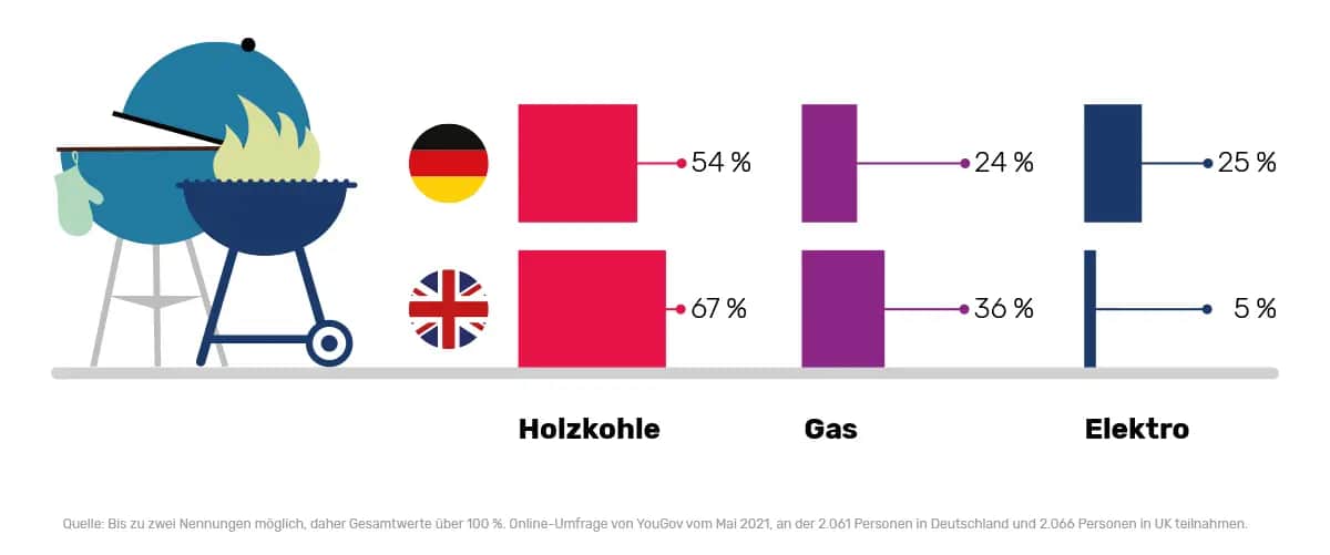 Bei der Beliebtheit und Häufigkeit des Grillens gibt es also deutliche Unterschiede zwischen den Nationen. Einigkeit – wenn auch in unterschiedlicher Ausprägung – herrscht bei der bevorzugten Grillart: Gut zwei Drittel (67%) der Briten setzen hier auf den klassischen Holzkohlegrill. Bei den Deutschen ist es mit 54% zwar auch noch eine Mehrheit, allerdings nicht so massiv. Mit 36% steht bei den Briten der Gasgrill auf Platz zwei auf der Beliebtheitsskala, der Elektro-Außengrill ist dort mit 5% deutlich abgeschlagen.
