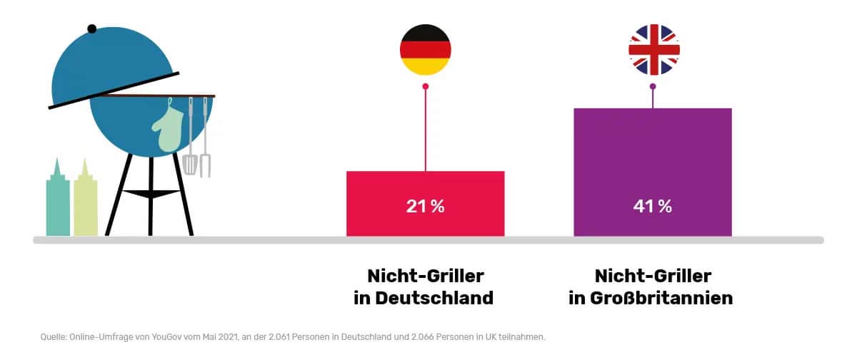 Beim Fleischersatz gab es dann doch wieder Unterschiede zwischen den Nationen. Während 9% der deutschen Haushalte angeben, dass vegetarische oder vegane Bratwürste meistens oder jedes Mal beim Grillen zubereitet werden, sind es bei den Briten rund 16%. Auch die Vegan-Verweigerer sind unterschiedlich stark vertreten: Zwei Drittel (66%) der Befragten aus Deutschland geben an, dass „nie“ vegetarische oder vegane Bratwürste auf ihrem Grill landen, bei den Briten sagt das genau die Hälfte, nämlich 50%.