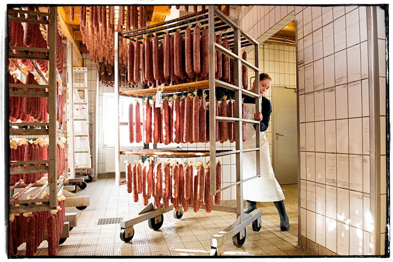 In unseren Reifekammern herrscht, wie in einem Weinkeller, ein besonderes Raumklima, das für die perfekte Reife nötig ist. Trotzdem brauchen die Würste, wie Wein- oder Champagnerflaschen, besondere Pflege, sie wandern im Verlauf des Reifeprozesses durch verschiedene Kammern, müssen auch regelmäßig abgewaschen werden.