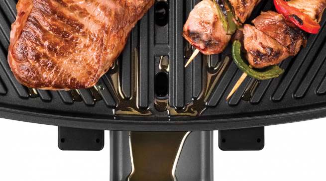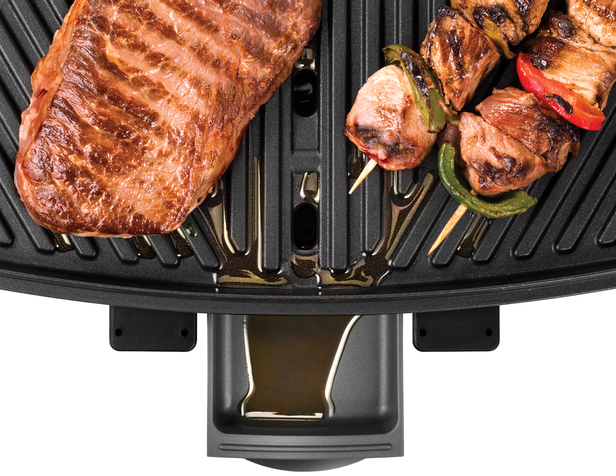 Die Grillplatte ist für die bequeme wie einfache Reinigung entnehmbar und antihaftbeschichtet. Und sie bietet die perfekte Kombination aus zwei Grillflächen: glatt (für feine Speisen) und geriffelt (für die typische Grill-Optik bei Steaks & Co.). Auch die Fettauffangschale ist ganz bequem entnehmbar.