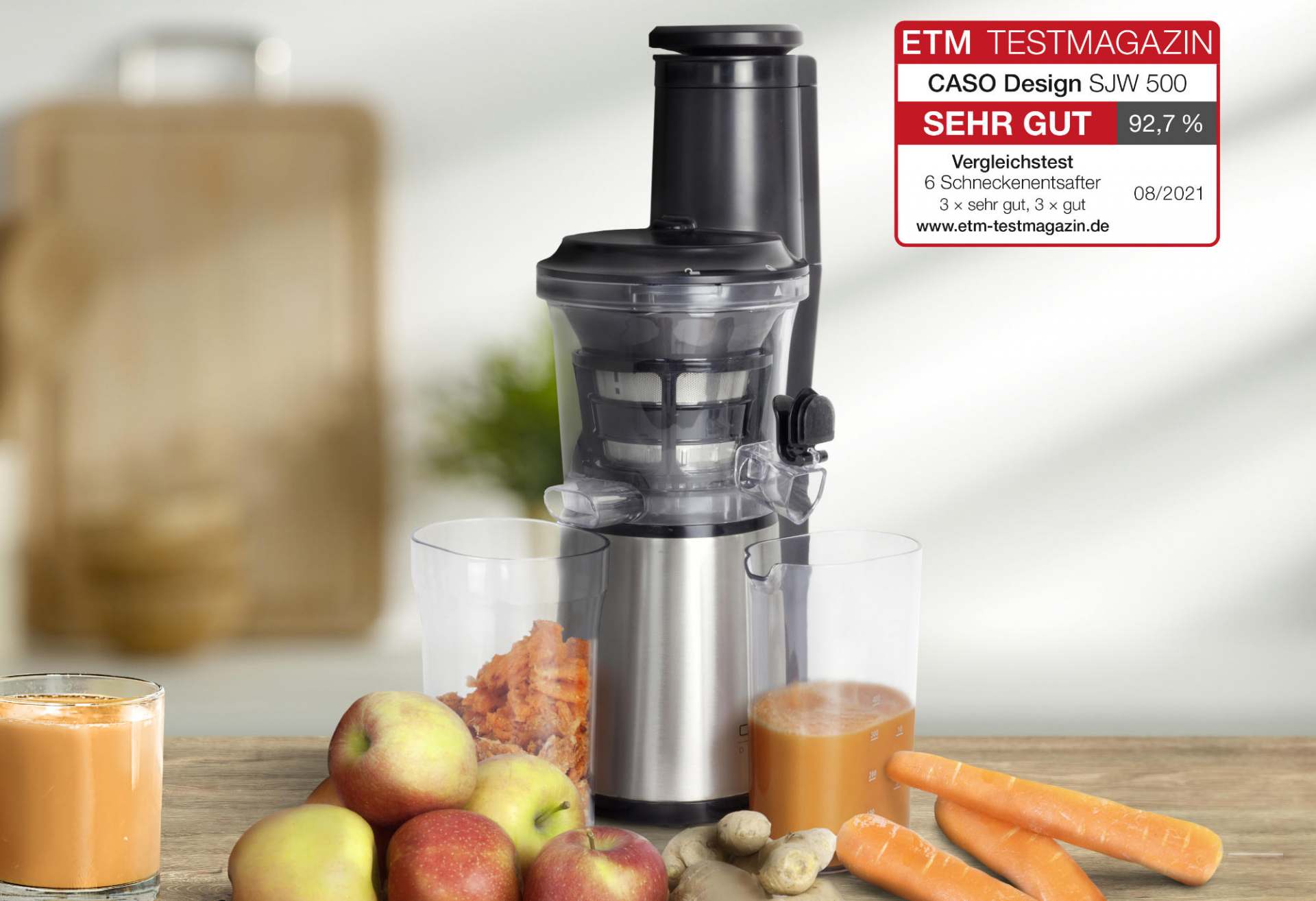 Das ETM Testmagazin, Ausgabe 08/2021 hat den Caso Design Entsafter SJW 500 im Vergleichstest der Schneckenentsafter mit „sehr gut“ ausgezeichnet. Der schlanke Caso erreichte im Test 92,7%.