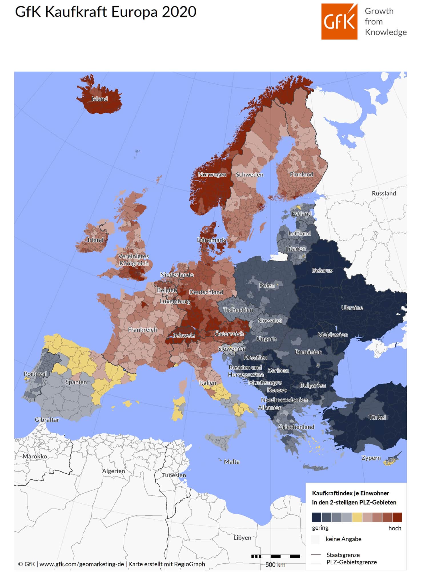 Die Studie „GfK Kaufkraft Europa 2020“ liegt für feinräumige Ebenen wie Gemeinden und Postleitzahlen vor, ebenso wie passende Daten zu Einwohnern und Haushalten sowie digitale Landkarten. Außerdem hat GfK den Corona Impact berechnet, der zeigt, wie sehr die jeweiligen Länder im europäischen Vergleich unter den Auswirkungen von Covid-19 gelitten haben.