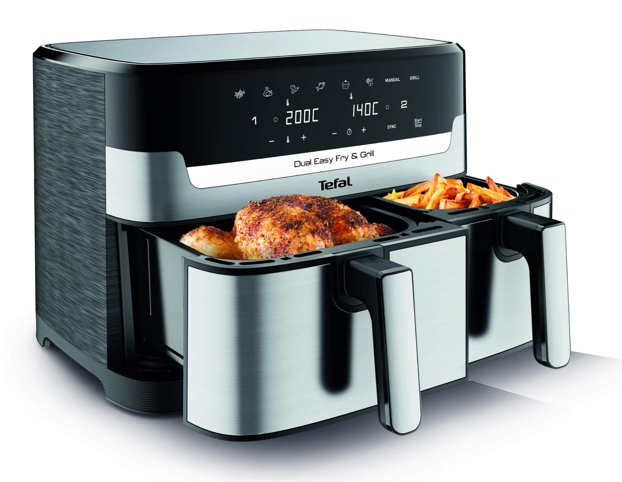 Tefal präsentiert mit der Dual Easy Fry & Grill Heißluftfritteuse eine multifunktionale Heißluftfritteuse mit Doppelkammer. Insgesamt verfügen die Modelle über eine Kapazität von 8,3 Liter, die sich auf zwei asymmetrische, unabhängige Garkammern aufteilt. Die 2-in-1-Technologie erlaubt zudem das gleichzeitige Frittieren und Grillen in beiden Schubladen.
