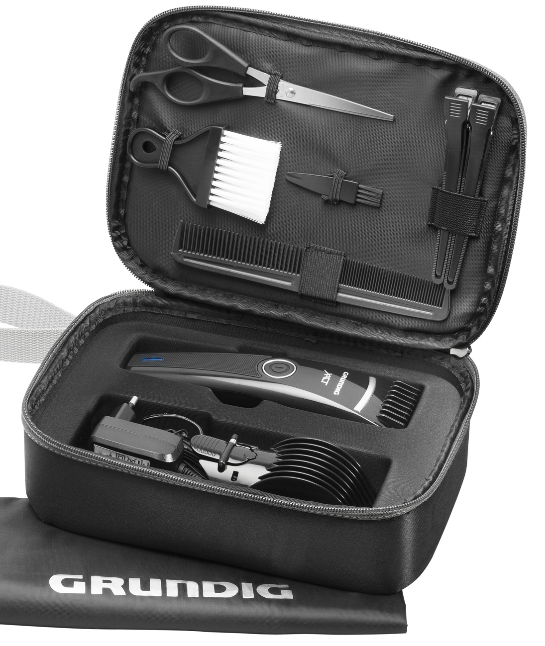 Der Grundig Haar- und Bartschneider MC 3341 besteht aus einem Set mit Rasierer, Kamm, Schere, Haarentfernungspinsel, Reinigungsbürste und Öl, die allesamt in einer hochwertigen Tasche aufbewahrt werden.