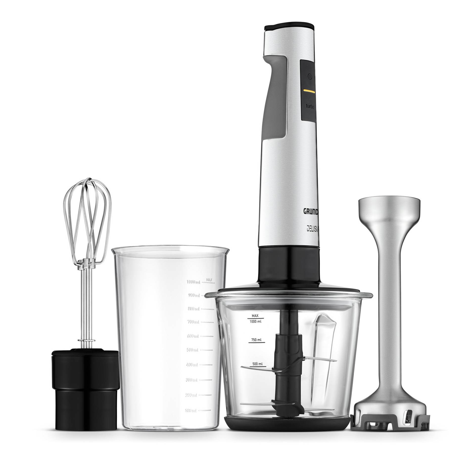 Im Set ist der Stabmixer erhältlich mit einem BPA-freiem Messbecher mit einem Liter Fassungsvermögen, einem zusätzlichen Edelstahl-Stabmixeraufsatz und einem praktischen 1,0 Liter Multizerkleinerer aus Glas. Mit zusätzlichem Schutz-Aufsatz eignet sich der Mixer auch zum Rühren, Pürieren und Mixen in besonders empfindlichen Töpfen und Behältern.